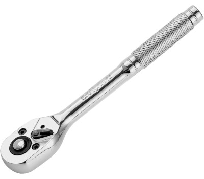 Цельнометаллический хромированный ключ-трещотка Сибртех 14014 из стали CrV, с посадочным размером 1/4″ и 45-зубым храповым механизмом, с функцией быстрого сброса, используется для монтажа и демонтажа резьбовых соединений. Предназначен для установки торцевых головок, адаптеров и удлинителей. Цельнометаллическая конструкция отличается повышенной прочностью, что позволяет работать со значительным усилием. Инструмент пригодится дома, в гараже и в поездке. Преимущества Прочность — ключ изготовлен из закаленной хромованадиевой стали и выдерживает высокие нагрузки. Долговечность — хромированная поверхность устойчива к образованию коррозии. Функция реверса — при помощи переключателя с металлическим флажком можно одним движением изменить направление вращения трещотки. Надежная фиксация — шариковый замок крепко удерживает торцевую головку, поэтому она не соскочит во время работы. Быстрый сброс — достаточно нажать на кнопку, чтобы освободить головку от насадки, это особенно удобно для работы с крепежом разного размера.