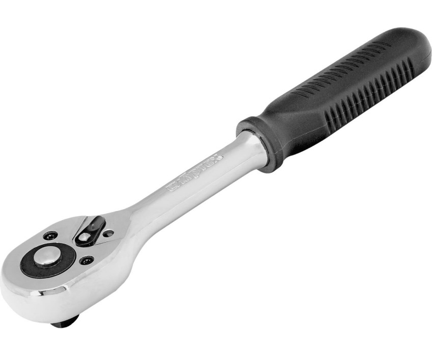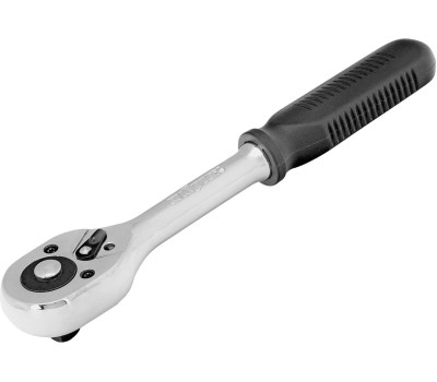 Хромированный ключ-трещотка Сибртех 14002 из стали CrV, с посадочным размером 3/8″ и 45-зубым храповым механизмом, с функцией быстрого сброса, используется для работы с резьбовым крепежом. Трещоточный механизм с 45 зубьями обеспечивает плавное вращение, облегчая работу. Инструмент пригодится дома, в мастерской и гараже. Преимущества Прочность — ключ изготовлен из закаленной хромованадиевой стали и выдерживает высокие нагрузки. Долговечность — зеркальное хромовое покрытие предотвращает образование коррозии. Эргономичность — рукоятка с нескользящей рельефной поверхностью надежно ложится в руку, поэтому работать инструментом комфортно. Функция реверса — при помощи переключателя с металлическим флажком можно одним движением изменить направление вращения трещотки. Надежная фиксация — шариковый замок крепко удерживает торцевую головку, поэтому она не соскочит во время работы. Быстрый сброс — достаточно нажать на кнопку, чтобы освободить головку от насадки, это особенно удобно для работы с крепежом разного размера.