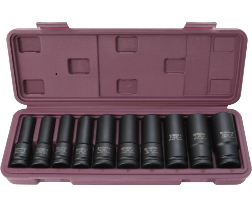 Торцевые головки Thorvik изготовлены с применением технологий, позволяющих передавать усилия, превышающие расчетные по современным стандартам на 30%. Широкий диапазон размеров, типов и профилей, высокая точность обработки, качественная хромомолибденовая сталь (Cr-Mo) и устойчивое фосфатированное покрытие делают инструмент надежным и долговечным. Имеют отверстие для фиксирующего штифта и выточка для уплотнительного кольца. Служит для начального откручивания крепежных деталей с 6-гранным рабочим профилем. Позволяет прилагать максимально допустимые для торцевых головок рабочие нагрузки. Головки торцевые ударные глубокие 1/2"DR: 10, 12, 13, 14, 17, 18, 19, 21, 22, 24 мм, в кейсе.