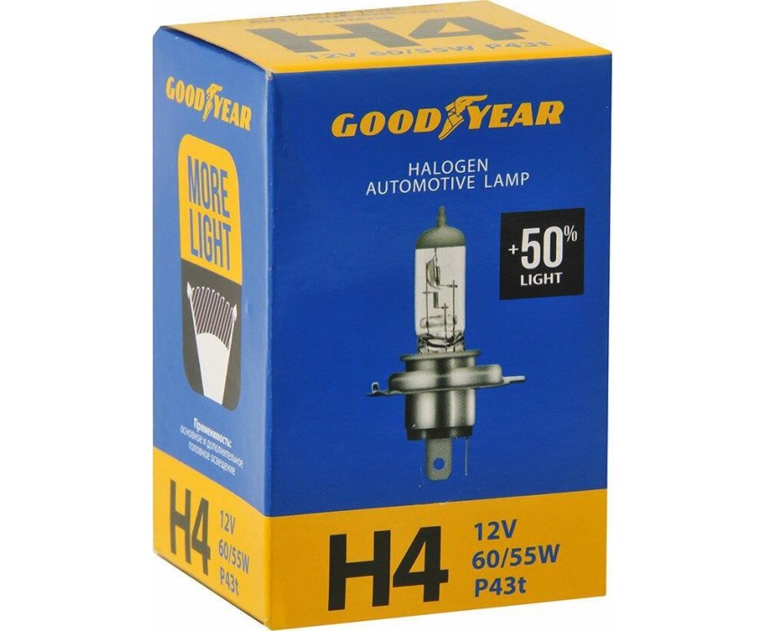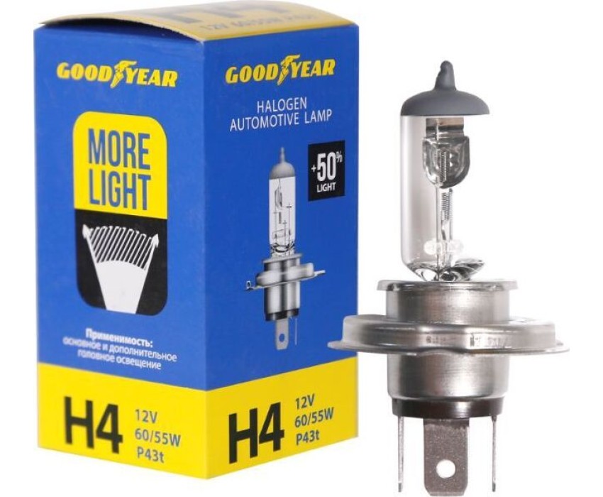 Галогенная лампа Goodyear More Light H4 используется в фарах ближнего и дальнего освещения. Goodyear More Light обладает увеличенным световым потоком. Площадь освещаемого участка дороги увеличена на 50%, по сравнению со стандартной модификацией ламп. При производстве ламп Goodyear More Light применяются особые технологии: повышение давления в колбе и изменение геометрии спирали. За счет этого длина светового луча увеличивается в 1,5 раза. Водитель сможет быстрее обнаружить препятствия на пути автомобиля и прочесть знаки дорожного движения. Благодаря лампам Goodyear More Light сохраняется больше времени для маневра. При изготовлении ламп Goodyear More Light H4 используется кварцевое немецкое стекло с UV фильтром, который защищает фары от негативного влияния ультрафиолетового излучения. " Напряжение: 12В " Мощность: 60/55Вт " Цоколь: P43t " Габариты ДхШхВ: 45x45x70 мм " Вес: 31-33 г.