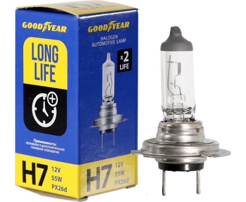 Галогенная лампа Goodyear Long Life H7 используется в фарах ближнего, дальнего света и противотуманных фонарях. Лампы Goodyear Long Life имеют увеличенный срок службы. При производстве ламп Goodyear Long Life изменяется геометрия нити накала, а давление в колбе увеличивается до 15Bar. Благодаря этому срок службы лампы Goodyear Long Life почти в два раза дольше базовой модификации. При изготовлении ламп Goodyear используется кварцевое немецкое стекло с UV фильтром, который защищает фары от негативного влияния ультрафиолетового излучения. Лампы Goodyear изготовлены на автоматизированном оборудовании, что позволило добиться сверхточной установки нити накала. Благодаря этому удалось сформировать равномерный световой поток и обеспечить хороший обзор. " Напряжение: 12В " Мощность: 55Вт " Цоколь: PX26d " Габариты ДхШхВ: 35x35x58 мм " Вес: 18-20 г.