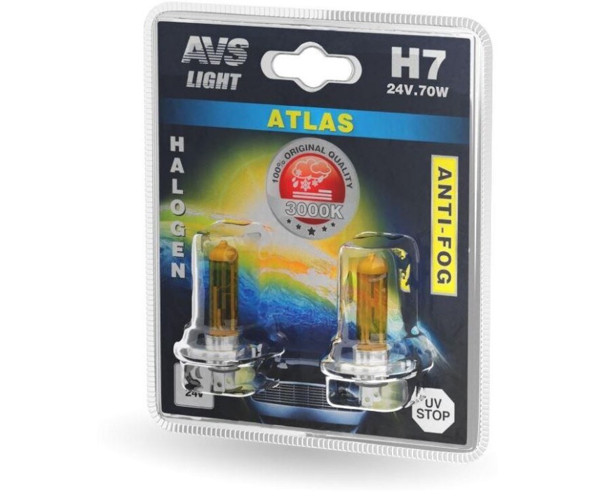 Лампа галогенная AVS /ATLAS ANTI-FOG/желтый H7. 24V.70W.блистер 2шт