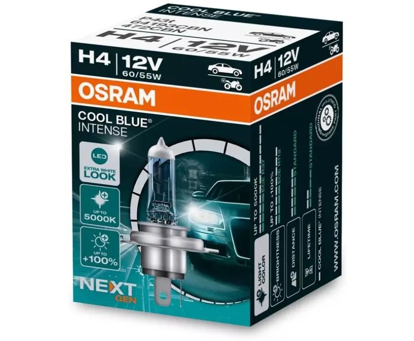 Кристально-белый свет с цветовой температурой до 5000 K Откройте для себя COOL BLUE INTENSE – высокотехнологичные галогенные лампы с цветовой температурой до 5000 Кельвинов1), 2). Их яркий белый холодный свет создает эффект светодиодного освещения – находка для ценителей дизайна и тюнинга автомобиля. Эти лампы обеспечивают высокую контрастность освещения с комфортным для глаз спектром, приближенным к естественному дневному. Яркость OSRAM COOL BLUE INTENSIVE на 100% больше по сравнению с минимальными требованиями стандарта ECE.1), 3). Современный дизайн конструкции с хромированным колпачком (H4/H7/H8/H11/HB4) – лампы идеально подходия для фар с прозрачными стеклами, придавая автомобилю стильный вид.