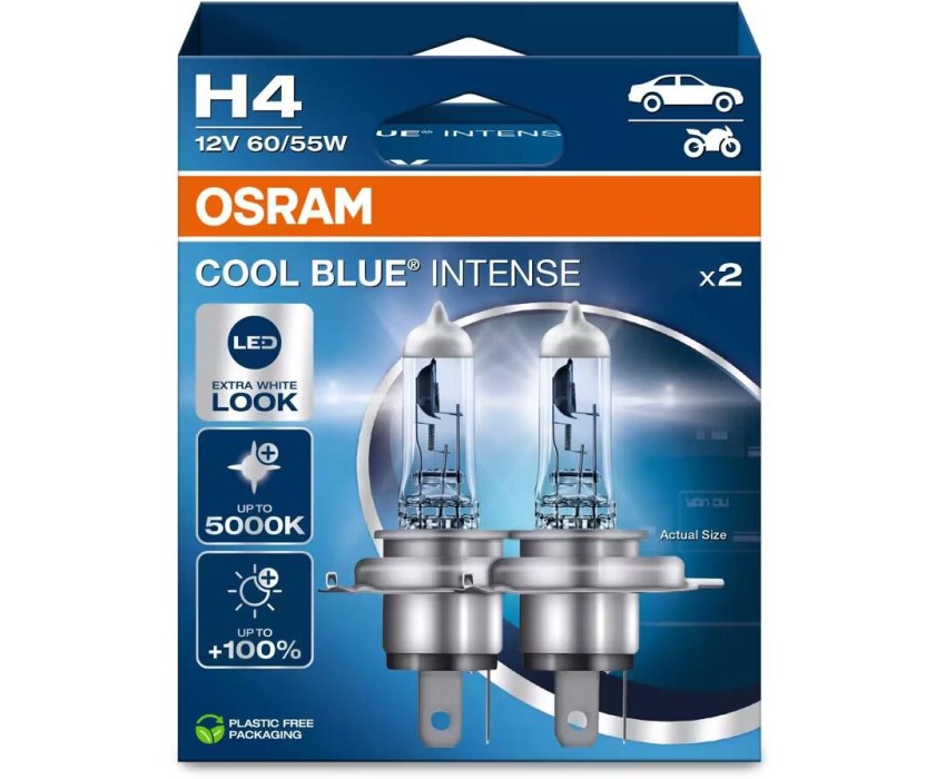 Кристально-белый свет с цветовой температурой до 5000 K Откройте для себя COOL BLUE INTENSE – высокотехнологичные галогенные лампы с цветовой температурой до 5000 Кельвинов1), 2). Их яркий белый холодный свет создает эффект светодиодного освещения – находка для ценителей дизайна и тюнинга автомобиля. Эти лампы обеспечивают высокую контрастность освещения с комфортным для глаз спектром, приближенным к естественному дневному. Яркость OSRAM COOL BLUE INTENSIVE на 100% больше по сравнению с минимальными требованиями стандарта ECE.1), 3). Современный дизайн конструкции с хромированным колпачком (H4/H7/H8/H11/HB4) – лампы идеально подходия для фар с прозрачными стеклами, придавая автомобилю стильный вид.