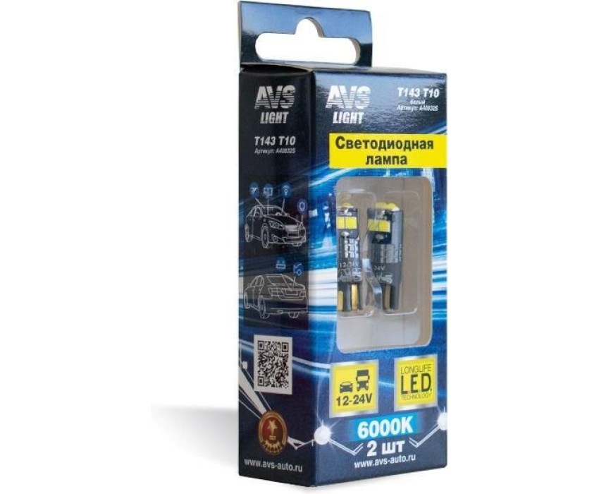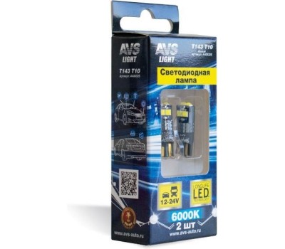 Лампа автомобильная AVS T143 T10/белый/ (W2.1x9.5d) CANBUS 6SMD 3030 12-24V 3W коробка 2 шт