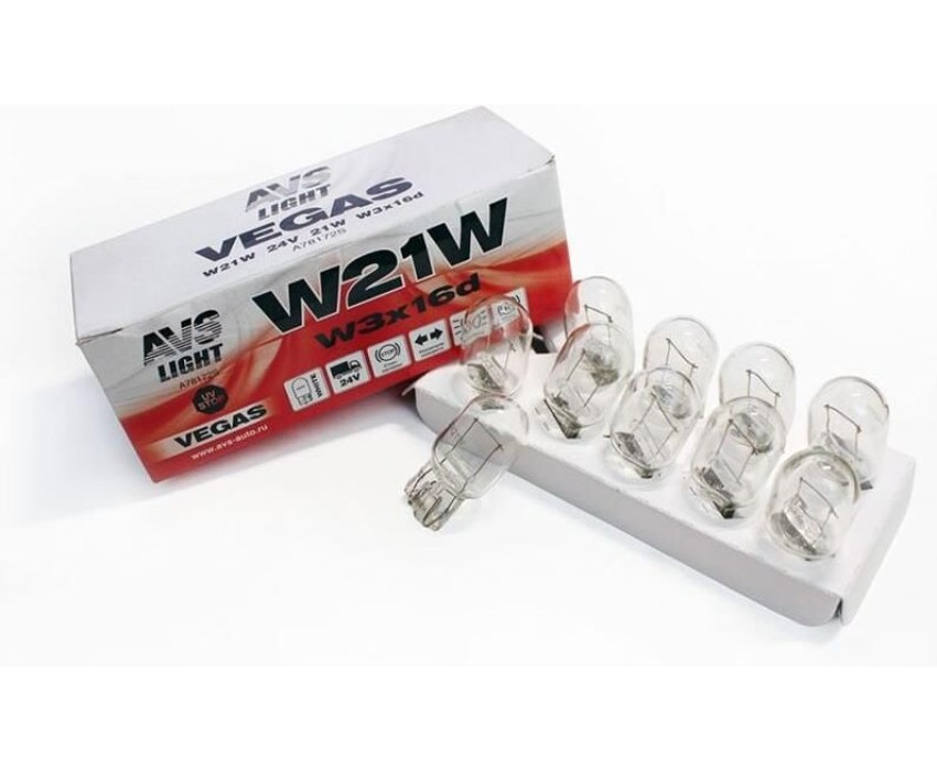 Лампа накаливания AVS Vegas W21W Тип цоколя: W3x16d Напряжение: 24 V. Мощность: 21 W.