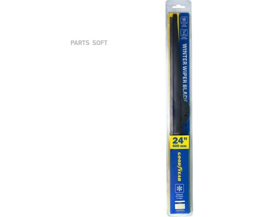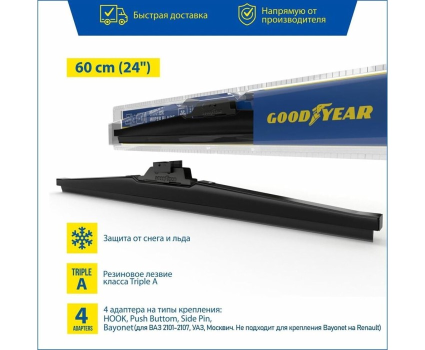 Зимняя щетка стеклоочистителя Goodyear WINTER 24"/60 cm, 4 переходника, В комплект входят переходники под крепления HOOK, Push Button, Side Pin, Bayonet. Благодаря этому стеклоочистители Goodyear «Winter» подходят на 95% всего автопарка России, в том числе на праворульные автомобили. Резиновое лезвие Triple A ( класса ААА) гарантирует качественную очистку стекла при любых погодных условиях. Идеальными для эксплуатации зимних щеток являются температуры от -50…+5° С.