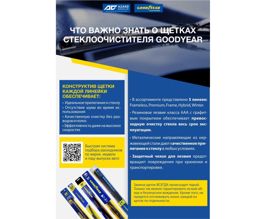 Уникальная система крепления адаптеров Clip Adapters (8 адаптеров на 11 видов крепления) позволяет использовать GOODYEAR PREMIUM на 99,8% всех моделей легковых автомобилей, в том числе с правым рулём Симметричный спойлер уникален в своём классе и выполнен из термопластичного эластомера, что делает его устойчивым к деформациям. Выполнен в виде литой конструкции и не имеет боковых заглушек, что значительно снижает обмерзание краёв щётки. Конструкция крепления лезвия имеет не только металлическую пластину на которой крепится лезвие, но и две дополнительные направляющие из нержавеющей стали, которые обеспечивают более прочное крепление резинового лезвия. Резиновое лезвие класса Triple A (ААА). Лезвие проходит процедуру полировки удаление шероховатостей поверхности.