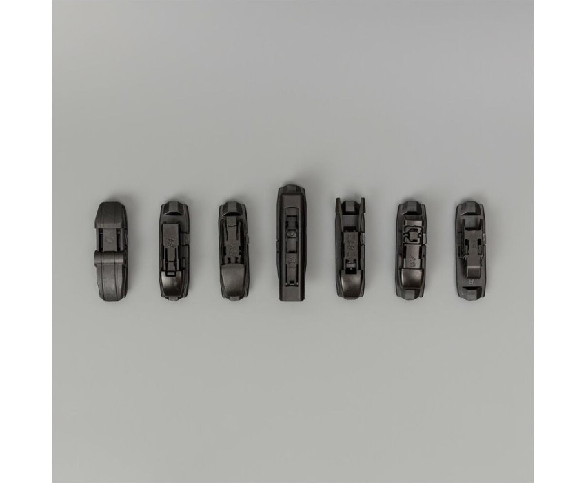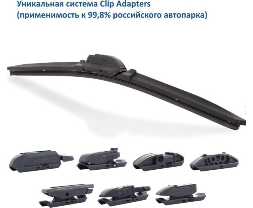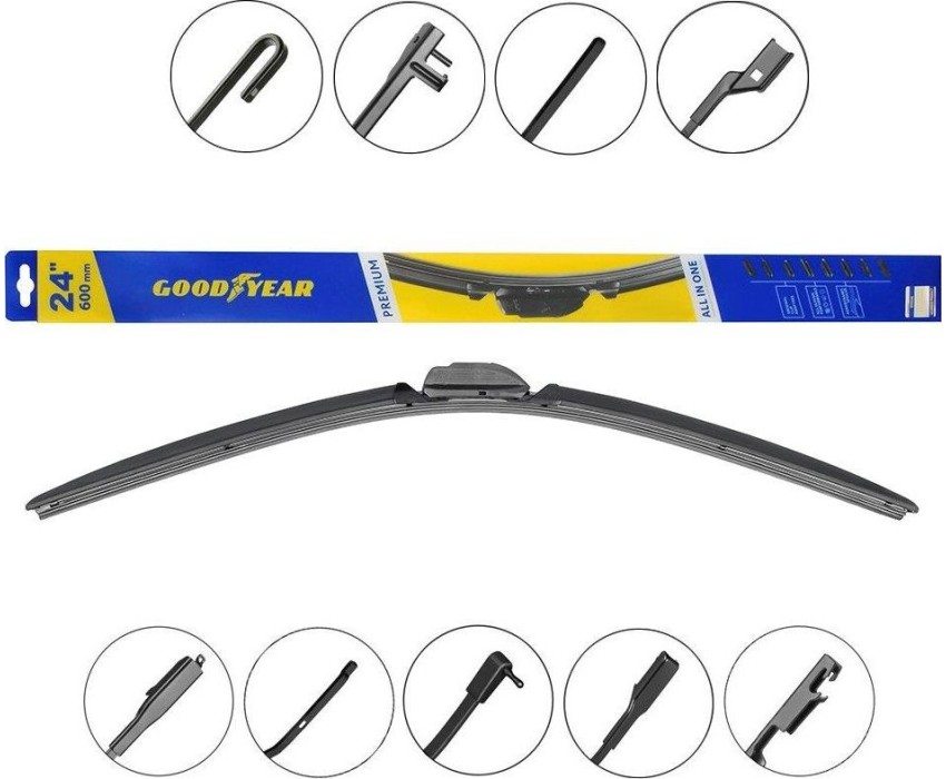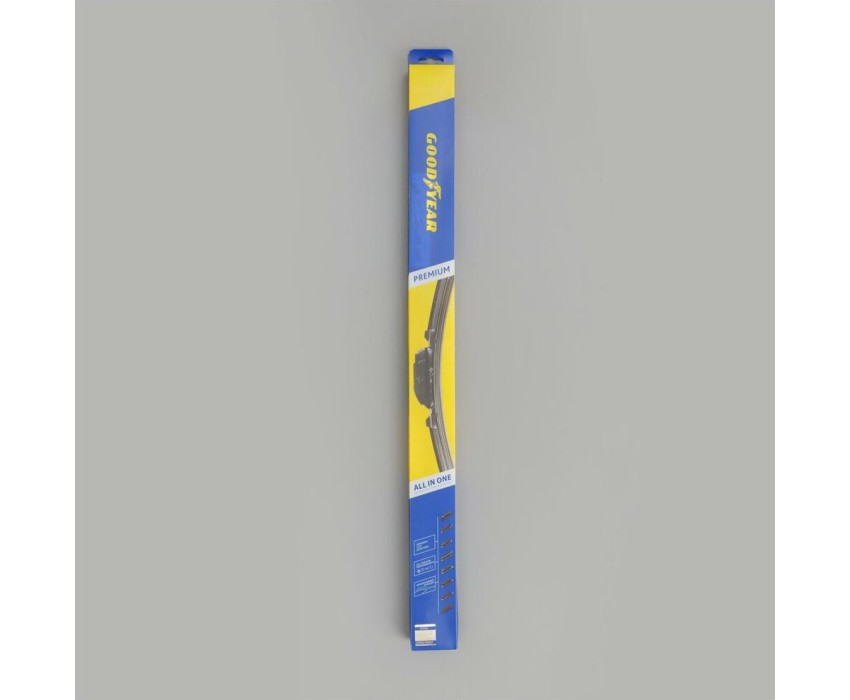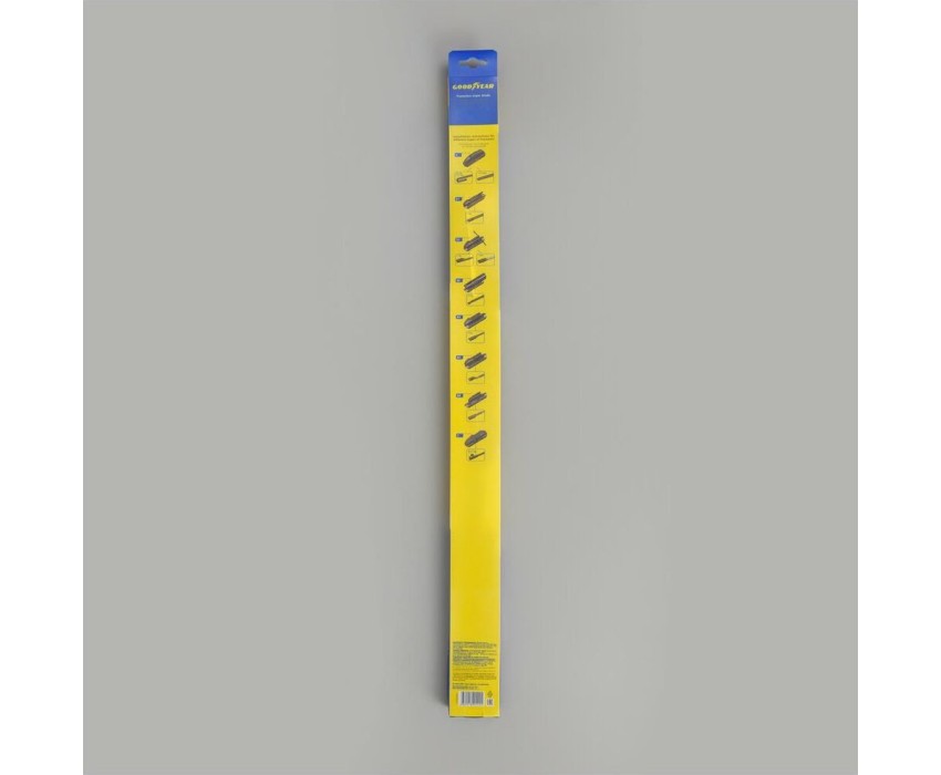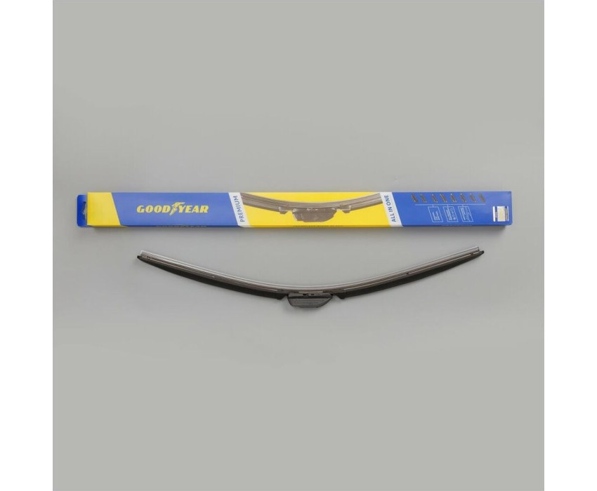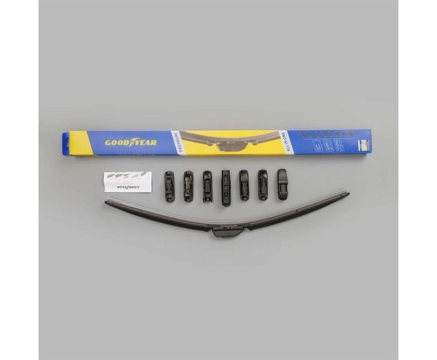 Уникальная система крепления адаптеров Clip Adapters (8 адаптеров на 11 видов крепления) позволяет использовать GOODYEAR PREMIUM на 99,8% всех моделей легковых автомобилей, в том числе с правым рулём Симметричный спойлер уникален в своём классе и выполнен из термопластичного эластомера, что делает его устойчивым к деформациям. Выполнен в виде литой конструкции и не имеет боковых заглушек, что значительно снижает обмерзание краёв щётки. Конструкция крепления лезвия имеет не только металлическую пластину на которой крепится лезвие, но и две дополнительные направляющие из нержавеющей стали, которые обеспечивают более прочное крепление резинового лезвия. Резиновое лезвие класса Triple A (ААА). Лезвие проходит процедуру полировки удаление шероховатостей поверхности.