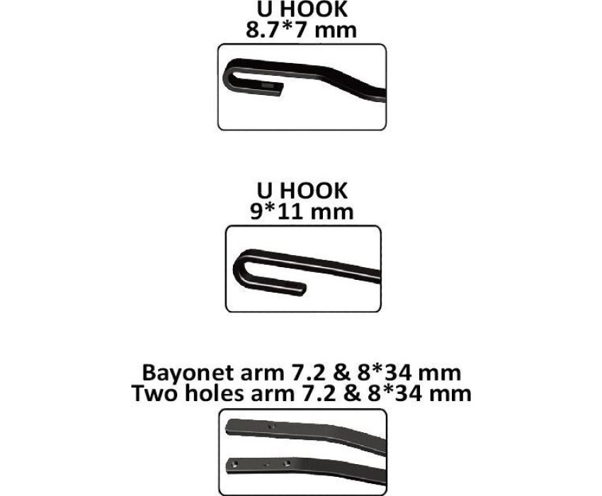 Крепление: Крючок Широкий диапазон температур Графитовое напыление Бесшумная работа Размер: 17" 43см Совместимость с креплениями: U HOOK (8.7*7mm), U HOOK (9*11mm), Bayonet arm (7.2&8*34mm) Two holes arm (7.2&8*34mm) ибридные щетки стеклоочистителя являются самыми современными и высокотехнологичными щетками представленными на рынке в настоящий момент. В них сочетаются оптимальная прижимная сила по всей поверхности вне зависимости от значения кривизны стекла и прекрасные аэродинамические характеристики. Структура гибридной щетки обеспечивает высоту сопоставимую с бескаркасной благодаря чему сочетаются внешний вид и практичность без потери качества. Универсальный адаптер обеспечит возможность установки на большинство (более 95%) российских и иностранных автомобилей с традиционными типами поводков.
