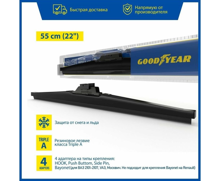 Зимняя щетка стеклоочистителя GOODYEAR WINTER 22"/55 CM, 4 переходника В комплект входят переходники под крепления HOOK, Push Button, Side Pin, Bayonet. Благодаря этому стеклоочистители Goodyear «Winter» подходят на 95% всего автопарка России, в том числе на праворульные автомобили. Резиновое лезвие Triple A ( класса ААА) гарантирует качественную очистку стекла при любых погодных условиях. Идеальными для эксплуатации зимних щеток являются температуры от -50…+5° С.