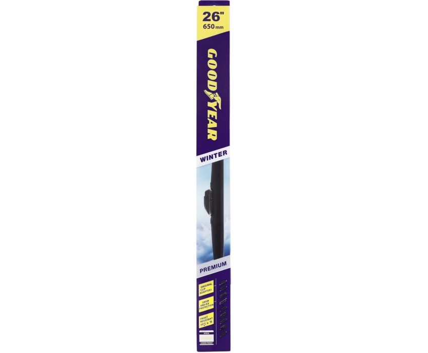 Зимняя щетка стеклоочистителя Goodyear «Winter Premium» с уникальной системой креплений адаптеров Original Clip Adapters позволяет использовать GOODYEAR WINTER PREMIUM на 99,8% всех моделей легковых автомобилей. В комплекте 9 адаптеров на 11 видов крепления: Hook, Side Pin, Push Button (19 mm), Pinch Tab, Bayonet, Narrow Push Button (17 mm), Guide Lock (DNTL1.1), Cap Lock (VATL5.1), Cover Lock (MBTL1.1), Bayonet ARM, AeroClip. Уникальная зимняя щетка стеклоочистителя великолепно очищает стекла автомобиля даже в условиях «мокрого» снега и наледи. Резиновый герметичный чехол с проклеенными краями защищает каркас щетки от обледенения. Менее подвержена коррозии и имеет увеличенный ресурс. Клиновидная форма лезвия с высоким профилем, позволяет получить качественную очистку лобового стекла. Резиновое лезвие Triple A ( класса ААА) гарантирует качественную очистку стекла при любых погодных условиях. Идеальными для эксплуатации зимних щеток являются температуры -50…+5° С.
