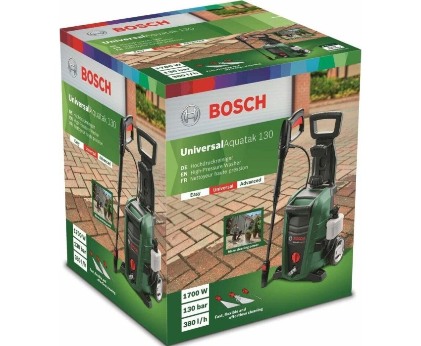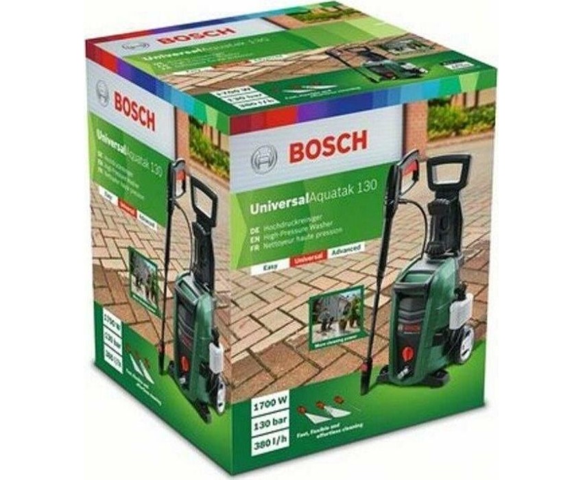 Мощность: 1700 Вт. Длина кабеля: 5 м. Длина шланга: 6 м. Максимальная производительность: 380 л/ч. Максимальная температура используемой воды: 40 °C. Максимальное давление: 130 бар. Напряжение: 230 В. Производительность самовсасывания: 0.5 м. Серия: UniversalAquatak. Тип насоса: три цилиндра. Тип рукоятки: складной. Уровень звукового давления: 73 дБ(А). Уровень звуковой мощности: 86 дБ(А). Вес: 7.8 кг. Габариты упаковки: 444х375х365 мм. Водный фильтр: образование пены под высоким давлением. Катушка для шланга: ручная. Высота рукоятки: 0.87 м. Тип шланга: ПВХ.