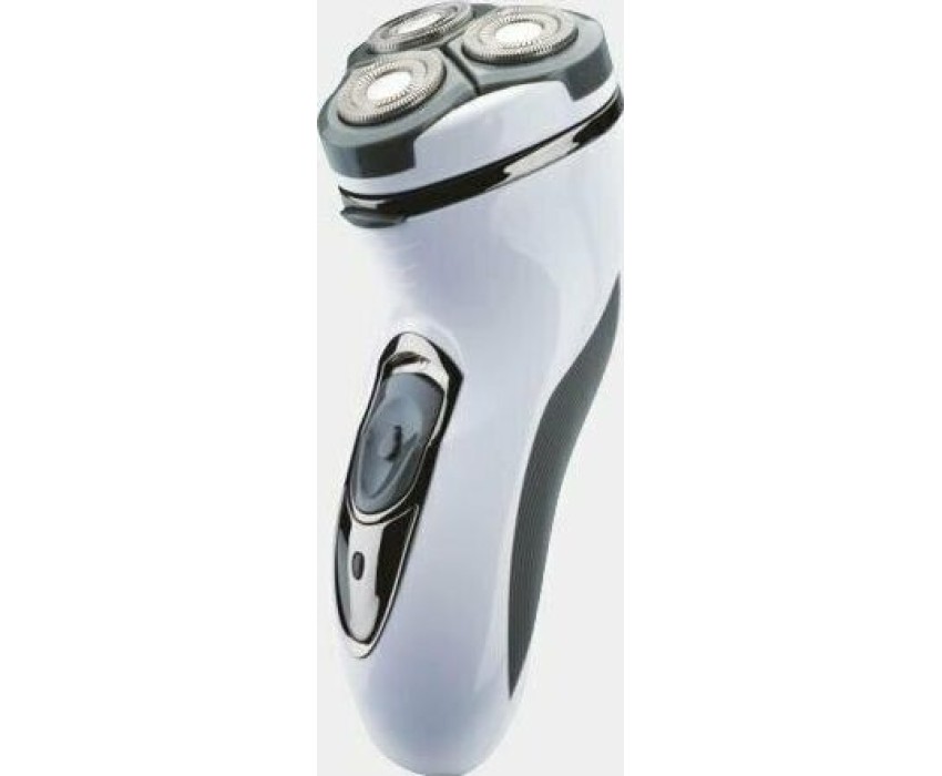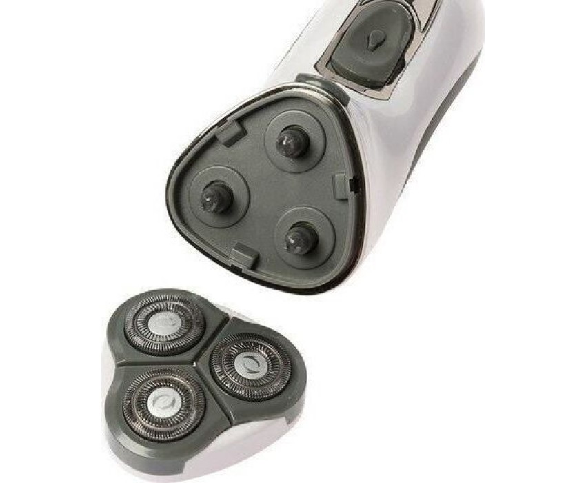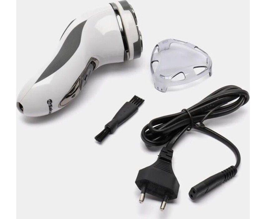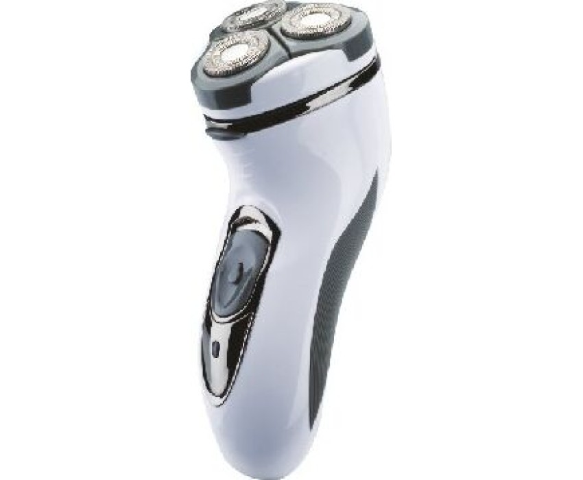 Бритва электрическая, работа от аккумулятора Ni-Cd (600 мА/ч), зарядка от сети 220-240В. 3 плавающие бритвенные головки. Сухое бритье. Бритвенные головки роторные. Щеточка д/очистки, мешочек д/хранения и переноски.