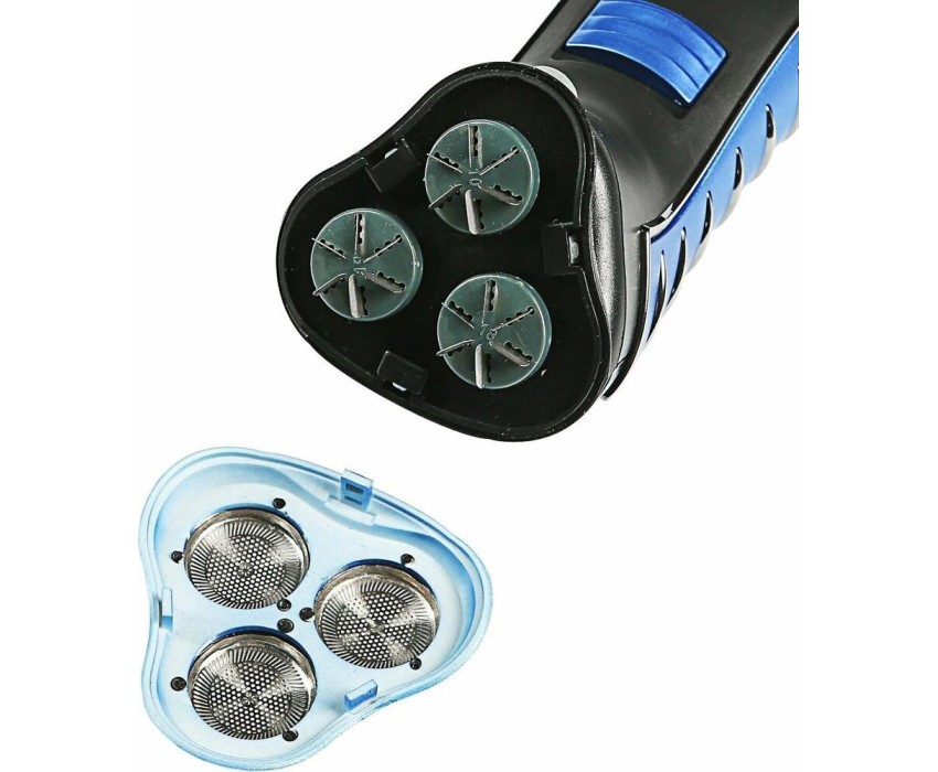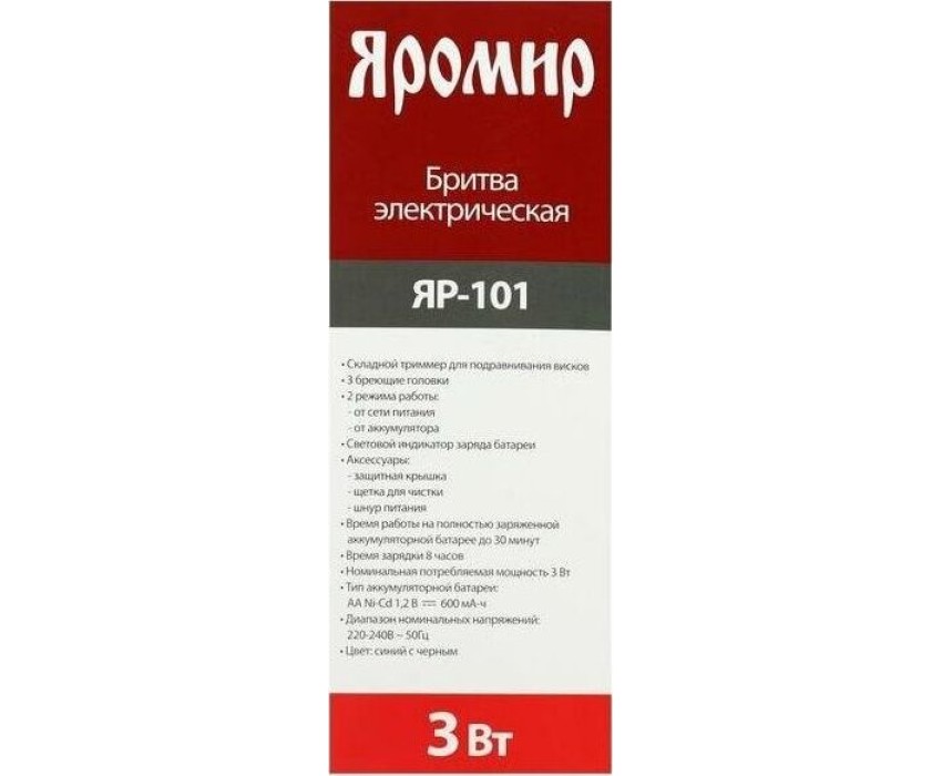 Мощность 3 Вт. Напряжение 1,2 В. Время работы на полностью заряженной аккумуляторной батарее 30 мин. Время зарядки 8 часов. 3 бреющие головки. Встроенный триммер для подравнивания висков. Электропитание от аккумуляторной батареи: Ni-Cd аккумулятор. Индикатор заряда батареи. Цвет: синий с черным. Аксессуары: Щетка для чистки, Защитная крышка, Сетевой шнур.