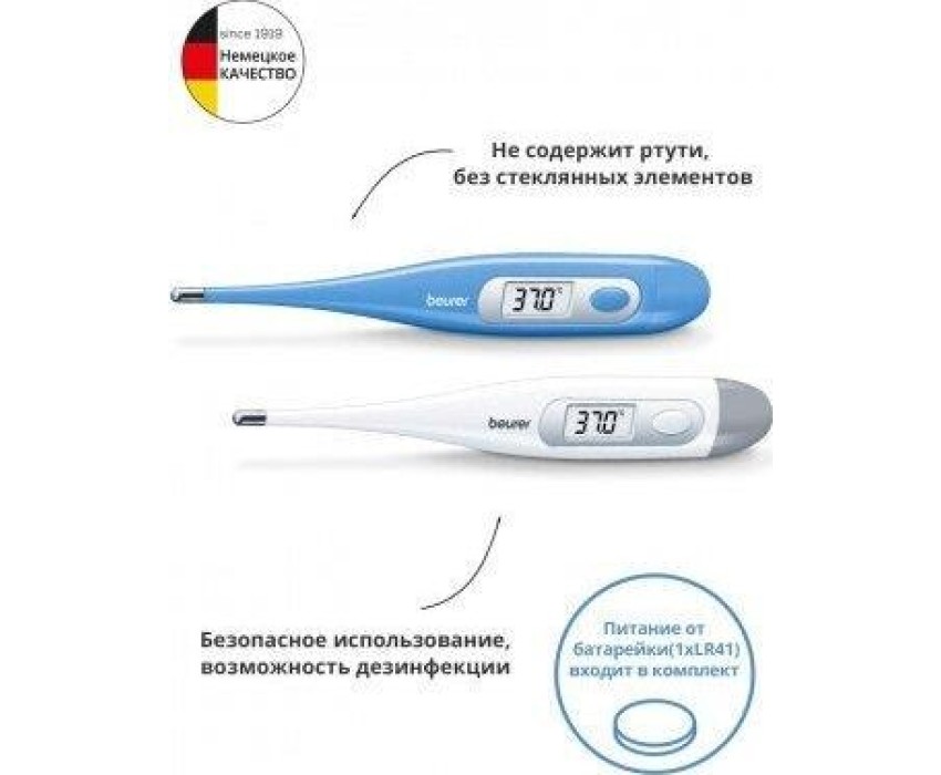 Время измерения: несколько секунд. Измерение: по Цельсию. Диапазон измерения по Цельсию: 35,5-42. Измерение орально: есть. Измерение аксиллярно: есть. Измерение ректально: есть. Измерение температуры тела: есть. Подсветка дисплея: есть. Звуковой сигнал: есть. Автоматическое отключение: есть. Водонепроницаемый корпус: есть. Тип элемента питания: LR41. Количество элементов питания: 1. Индикатор заряда батареи: есть. Цвет: белый. Защитный колпачок для наконечника: есть. Особенности: Медицинский термометр для контактного измерения температуры прост в применении и имеет водонепроницаемый корпус. Не содержит ртуть, без стекла. Индикация последнего результата измерения . Габариты упаковки (ед) ДхШхВ: 0.04x0.02x0.17. Вес упаковки (ед): 0.12. Гарантия: 12 мес.. Точность измерения: +/-0.1°С. Измерение: по Цельсию, 35,5-42. Точность измерения: +/-0.1°С. Тип элемента питания: LR41. Время измерения: несколько секунд