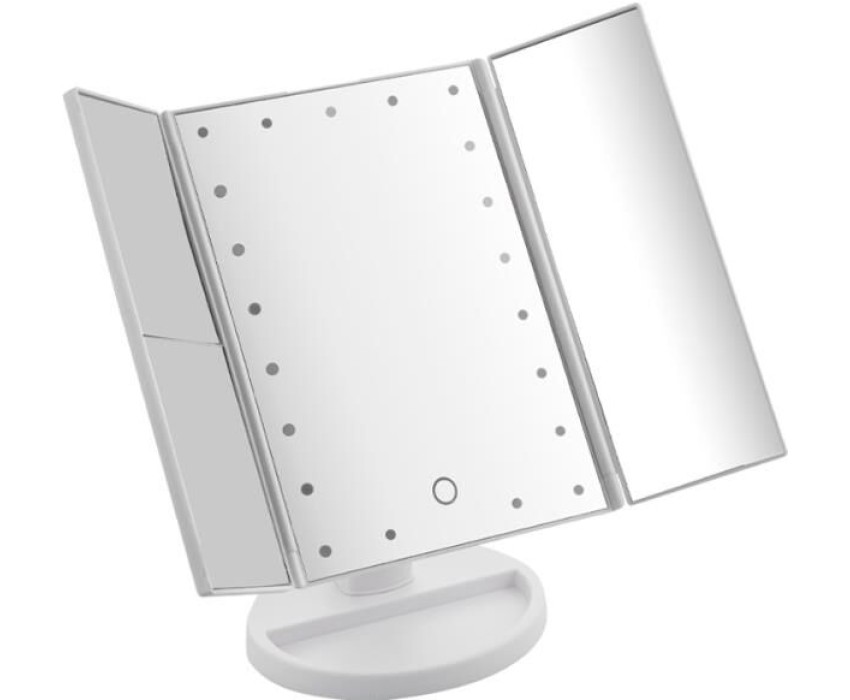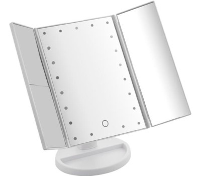 Зеркало косметическое, настольное, белое, со светодиодной подсветкой, раскладное, сенсорное, с подставкой для макияжных принадлежностей. Изготовлено из прочного пластика АБС, удобное для косметических процедур, нанесения макияжа и бритья, имеет вставки зеркал с двойным и тройным увеличением. Устанавливается на любую поверхность. Габаритные размеры: ширина 345 мм, высота 270, высота зеркал 240, ширина зеркал 80 мм и 160 мм и 80 мм, основание 160 мм. Вес - 0,900 кг, объём - 0,00395 м3.