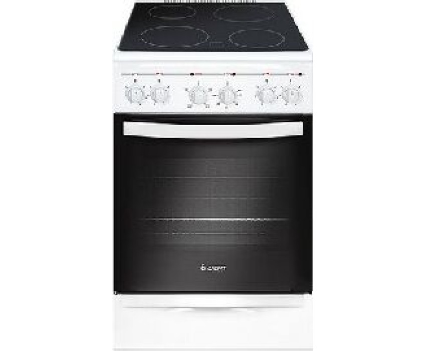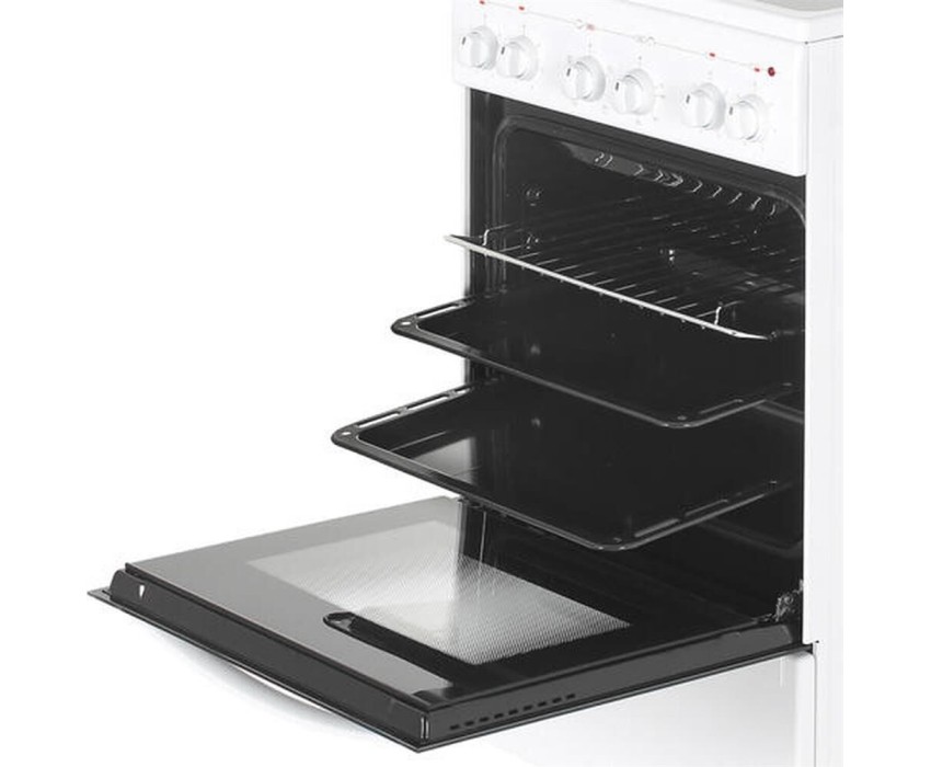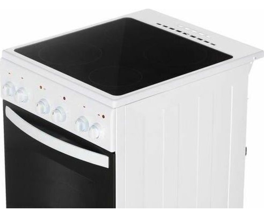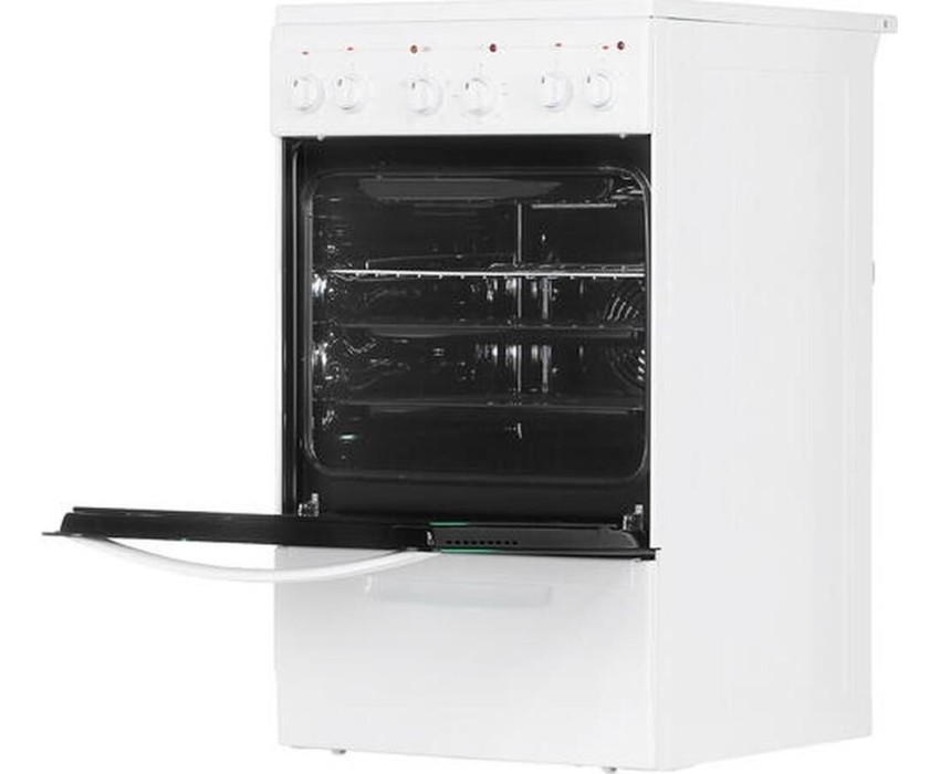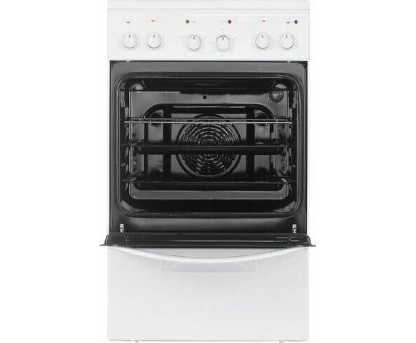 Габариты, ШхГхВ, см: 50x58.5x85; Цвет: белый; Дизайн: классический; Ширина, см: 50; Фасад: эмалированный; Варочная поверхность: стеклокерамическая; Количество зон приготовления: 4; Класс энергоэффективности: А; Диапазон номинальных напряжений, В: 220-230; Номинальная потребляемая мощность электроэнергии, кВт: 5,63-6,15; Объем духовки, л: 52; Конвекция; Мощность верхнего ТЭН духовки, кВт: 0,8; Мощность нижнего ТЭН духовки, кВт: 1,2; ТЭН-гриль: 1,2; Управление: механическое; Гриль: электрический; Подсветка духовки: одинарная; Направляющие духовки: штампованные; Терморегулятор; Ящик для посуды и принадлежностей: выдвижной ящик; Ножки регулировочные; Сетевой шнур и вилка: в наличии; Комплектность: решетка духовки, жаровня 2 шт