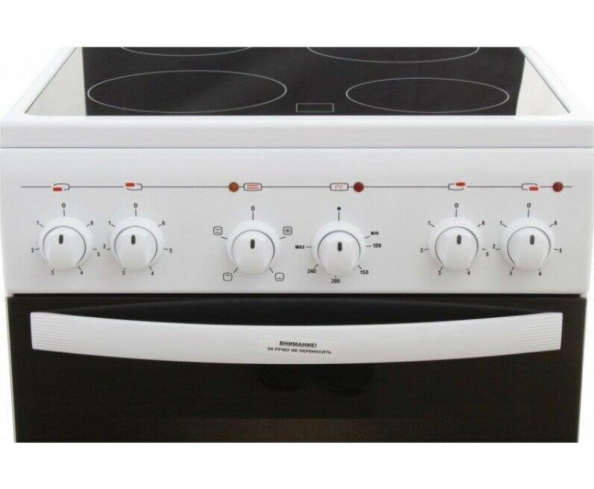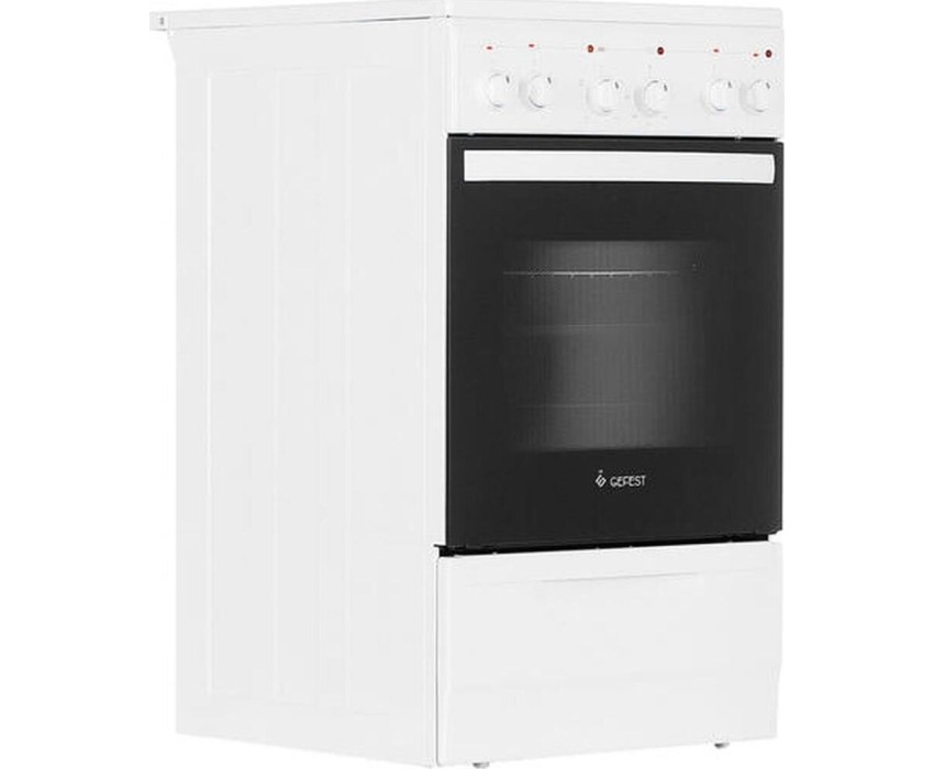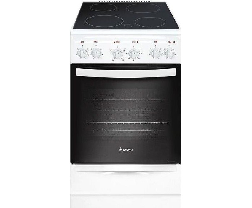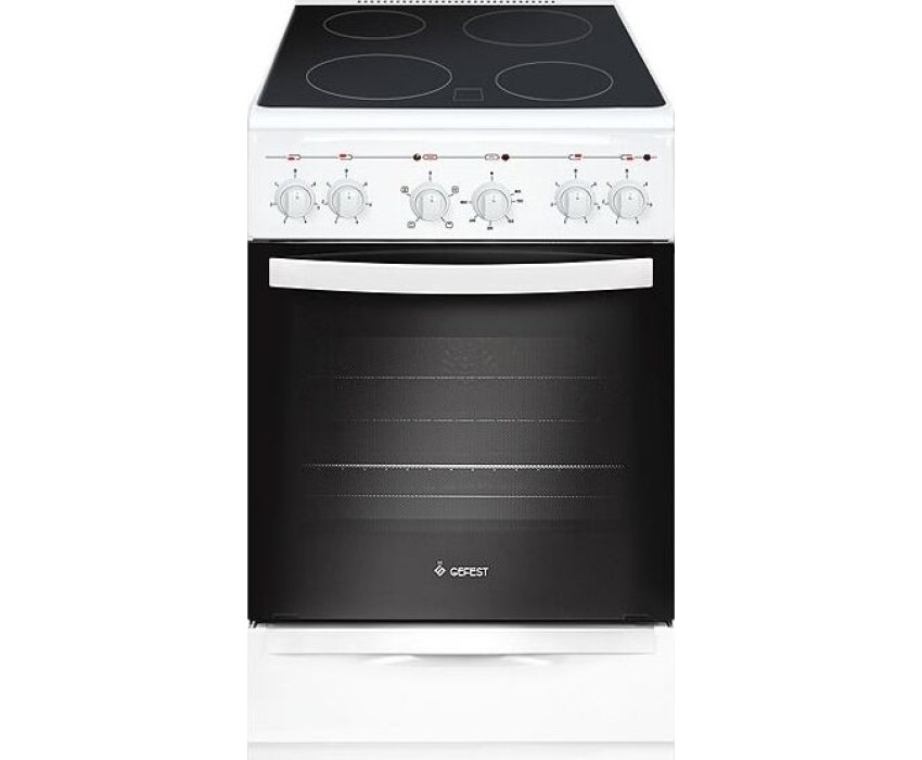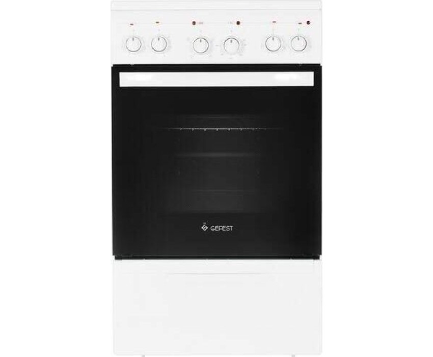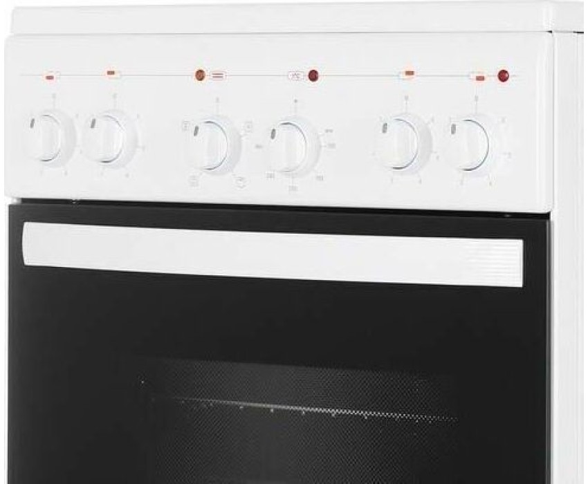 Габариты, ШхГхВ, см: 50x58.5x85; Цвет: белый; Дизайн: классический; Ширина, см: 50; Фасад: эмалированный; Варочная поверхность: стеклокерамическая; Количество зон приготовления: 4; Класс энергоэффективности: А; Диапазон номинальных напряжений, В: 220-230; Номинальная потребляемая мощность электроэнергии, кВт: 5,63-6,15; Объем духовки, л: 52; Конвекция; Мощность верхнего ТЭН духовки, кВт: 0,8; Мощность нижнего ТЭН духовки, кВт: 1,2; ТЭН-гриль: 1,2; Управление: механическое; Гриль: электрический; Подсветка духовки: одинарная; Направляющие духовки: штампованные; Терморегулятор; Ящик для посуды и принадлежностей: выдвижной ящик; Ножки регулировочные; Сетевой шнур и вилка: в наличии; Комплектность: решетка духовки, жаровня 2 шт