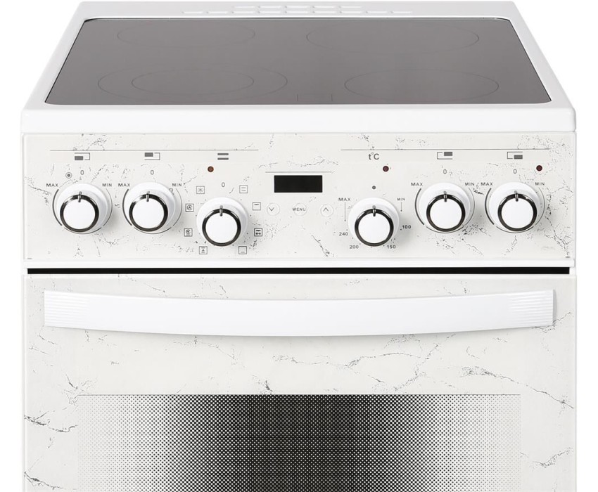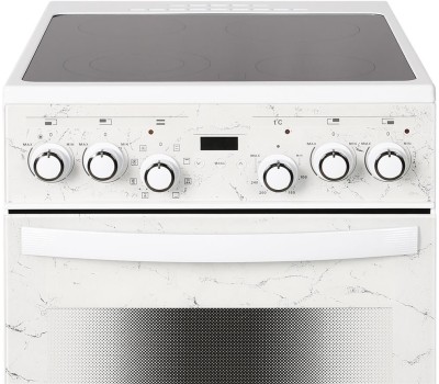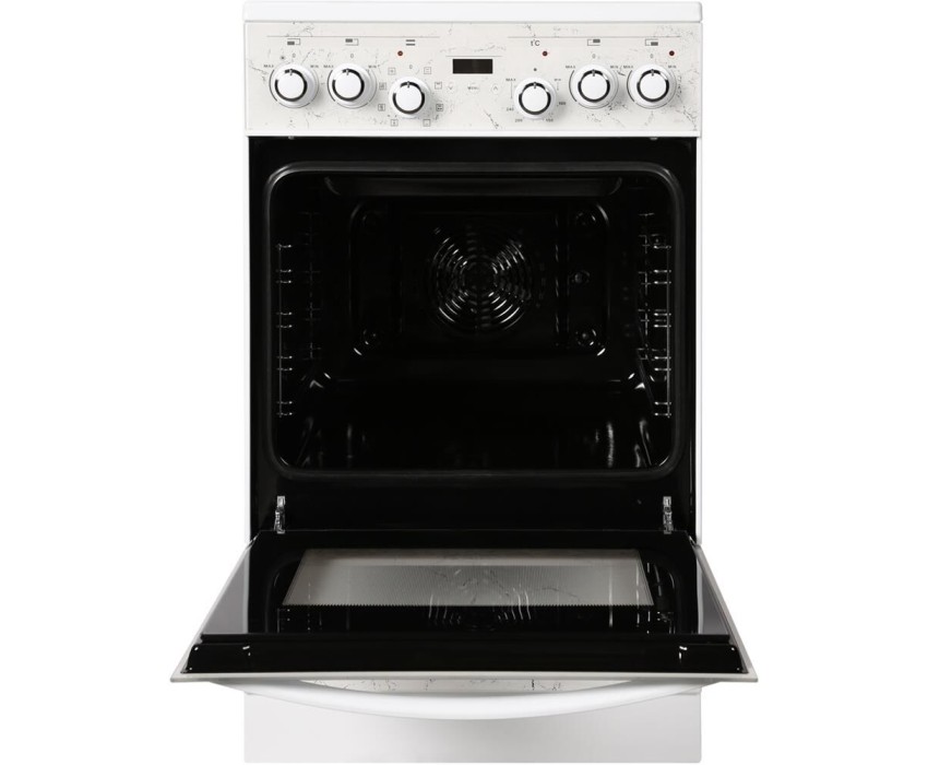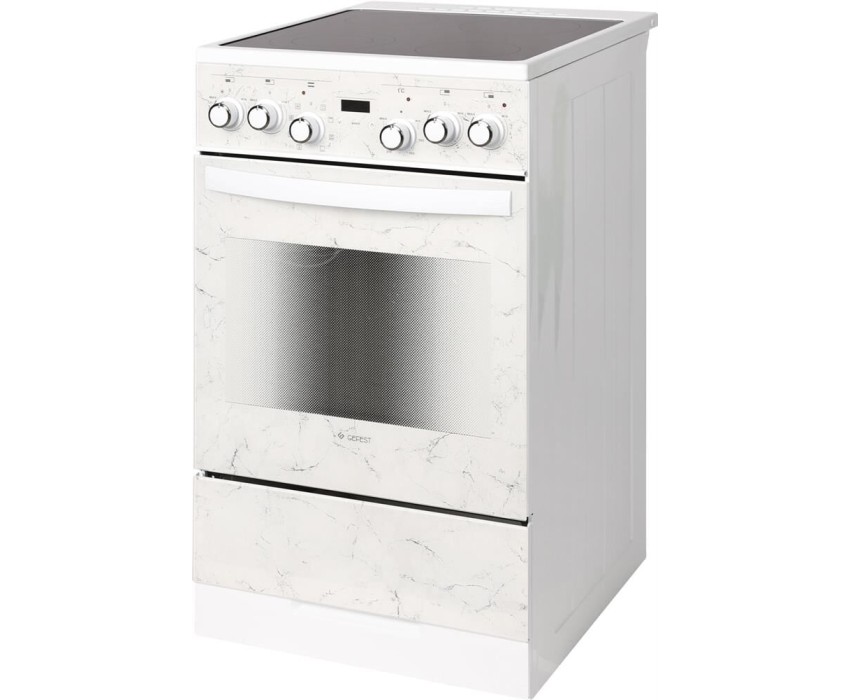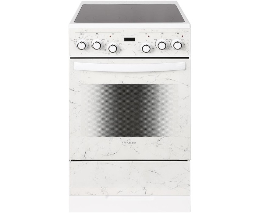 Габариты, ШхГхВ, см: 50x58.5x85; Цвет: белый, с рисунком "мрамор"; Дизайн: мрамор; Ширина, см: 50; Фасад: закаленное стекло; Варочная поверхность: стеклокерамическая; Количество зон приготовления: 4; Класс энергоэффективности: А; Диапазон номинальных напряжений, В: 220-230; Номинальная потребляемая мощность электроэнергии, кВт: 6,72-7,35; Объем духовки, л: 55; Конвекция; Мощность верхнего ТЭН духовки, кВт: 0,8; Мощность нижнего ТЭН духовки, кВт: 1,2; Мощность ТЭН вентилятора, кВт: 2,0; ТЭН-гриль: 1,2; Внутреннее покрытие духового шкафа: эмаль легкой очистки SMART CERAMIC; Управление: сенсорное , механическое; Таймер: сенсорный, многофункциональный; Двухзонные комфорки; Гриль: электрический; Вертел с электроприводом; Шашлычница; Ускоренный нагрев с конвекцией; Подсветка духовки: двойная; Направляющие духовки: съемные проволочные; Терморегулятор; Ящик для посуды и принадлежностей: выдвижной ящик; Ножки регулировочные; Сетевой шнур и вилка: в наличии