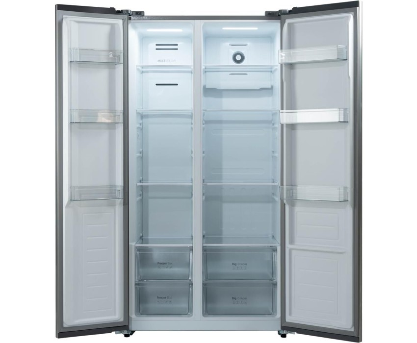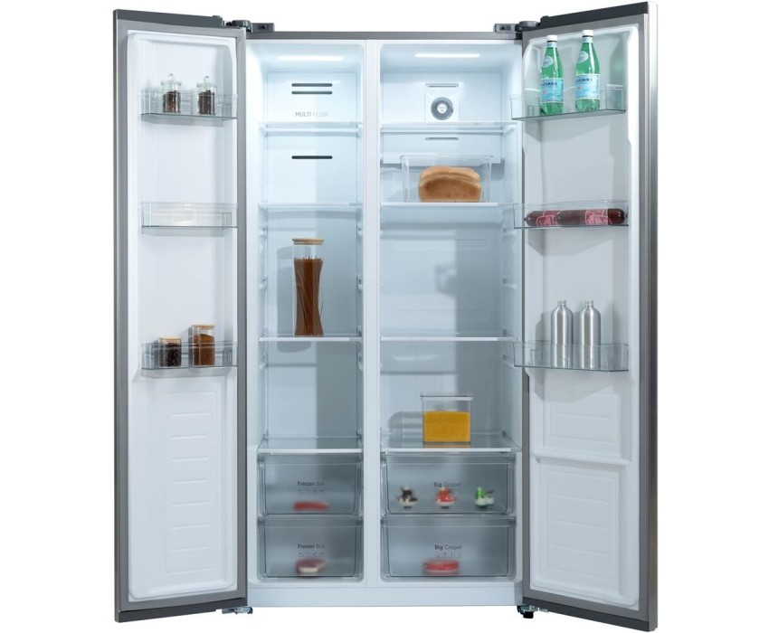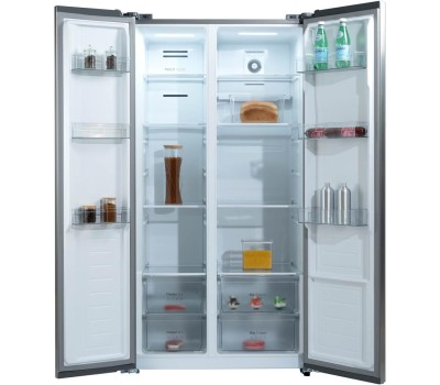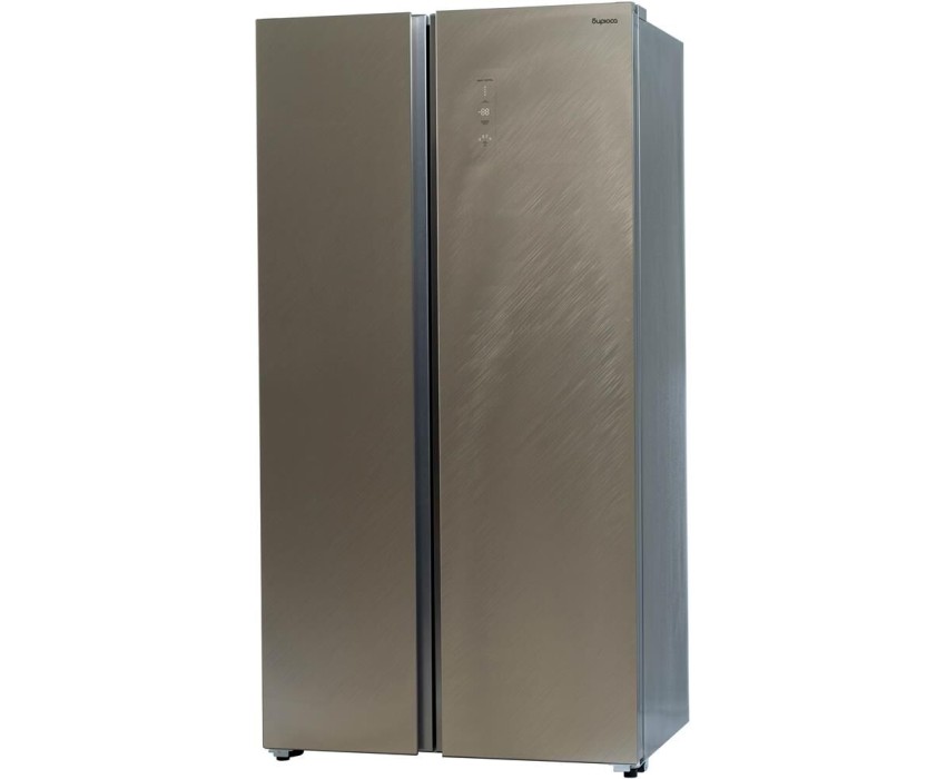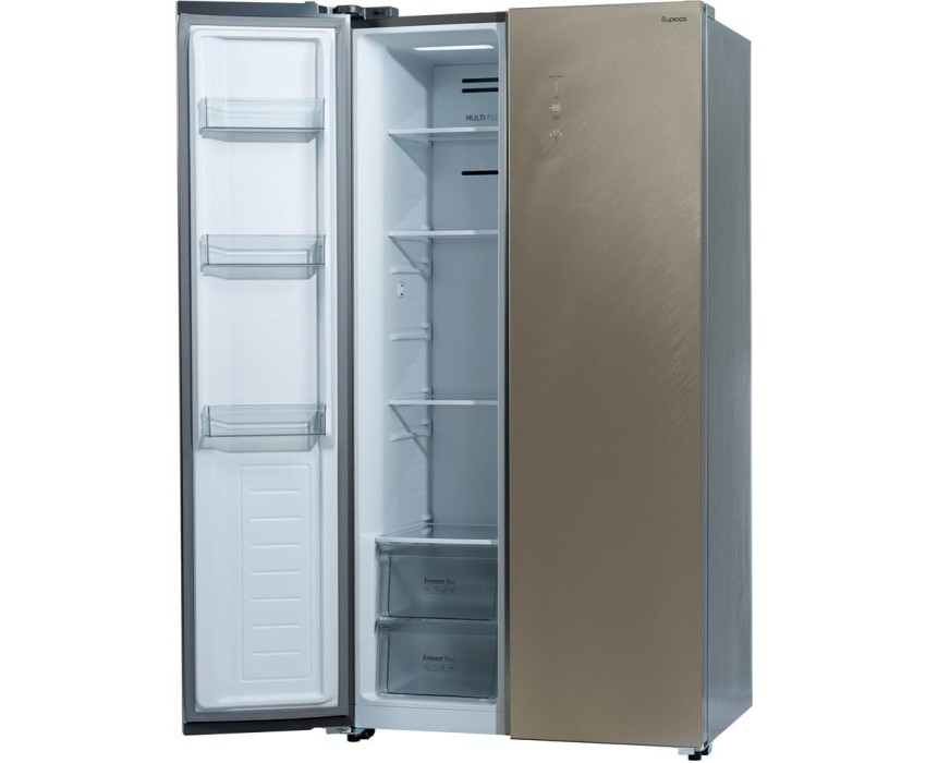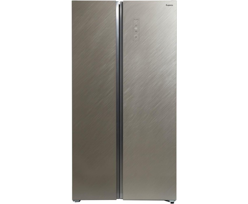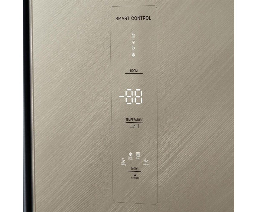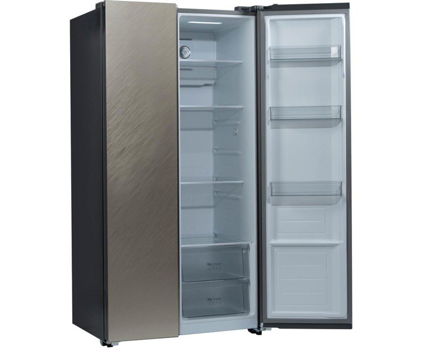 Холодильник Side-by-side с текстурированным бежевым стеклом • система Full No Frost • Dual Inverter: инверторные компрессор и вентилятор • дисплей на двери • система распределения воздушных потоков MultiFlow • класс энергоэффективности А++ • деодорирующий фильтр Nano Ag+ • габариты 178,5x91,3x67см • объем 541/343/198л
