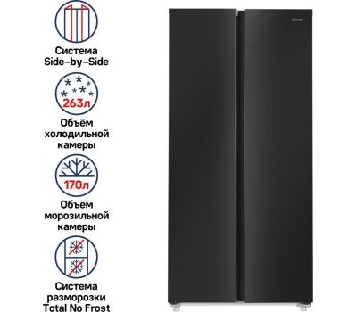 Количество камер: двухкамерный. Расположение морозильной камеры: сбоку. Тип управления: электронное. Класс энергопотребления: A+. Система размораживания: No Frost. Общий объем холодильника: 433. Общий объем холодильной камеры: 263. Общий объем морозильной камеры: 170. Уровень шума: 41. Мощность замораживания: 8. Количество полок: 4. Количество ящиков: 2. Материал полок: стекло. Антибактериальное покрытие: есть. Количество полок: 4. Система размораживания: No Frost. Тип: Холодильник. Полезный объем холодильника: 430. Хладагент: R600a. Количество ящиков: 2. Вес (нетто): 74. Количество дверей: 2. Тип компрессора: инверторный. Габариты упаковки (ед) ДхШхВ: 0.9x0.7x1.84. Вес упаковки (ед): 105. Страна производства: Китай. Инверторный компрессор: есть. Количество полок на дверце: 6. Материал дверей: металл. Наличие морозильной камеры: есть. Технология автоматического размораживания морозильной камеры: Total No Frost. Технология автоматического размораживания холодильной камеры: Total No Frost. Направление открывания двери: Side by Side. Гарантия: 12 мес.. Цвет: черный. Потребление энергии: 359 кВт*ч/год. Размеры (ШхВхГ): 83.3 х 177 х 63.7 см. Функции: суперзаморозка. Особенности конструкции: регулируемые по высоте ножки. Климатический класс: N, SN, ST. Индикация: звуковой сигнал незакрытой двери, температуры. Особенности холодильника: дисплей. Количество камер: двухкамерный. Объем: общий 433 л; холодильной камеры 263 л; морозильной камеры 170 л. Размеры (ШхВхГ): 83.3 х 177 х 63.7 …