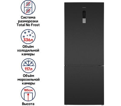 Количество камер: двухкамерный. Расположение морозильной камеры: снизу. Тип управления: сенсорное. Класс энергопотребления: A++. Система размораживания: No Frost. Общий объем холодильника: 453. Общий объем холодильной камеры: 336. Общий объем морозильной камеры: 117. Уровень шума: 42. Количество компрессоров: один. Мощность замораживания: 5. Количество полок: 4. Количество ящиков: 3. Материал полок: закаленное стекло. Зона свежести: есть. Антибактериальное покрытие: есть. Система размораживания: No Frost. Тип: Холодильник. Полезный объем холодильника: 432. Хладагент: R600a. Количество ящиков: 1. Вес (нетто): 80. Количество дверей: 2. Тип компрессора: инверторный. Габариты упаковки (ед) ДхШхВ: 0.751x0.76x1.92. Вес упаковки (ед): 105. Инверторный компрессор: есть. Количество полок на дверце: 4. Материал дверей: нержавеющая сталь. Наличие морозильной камеры: есть. Температура морозильной камеры max: -24. Температура морозильной камеры min: -16. Температура холодильной камеры max: 8. Температура холодильной камеры min: 2. Технология зоны свежести: Fresh Zone. Технология многопоточного охлаждения: Multi Air Flow. Тип дисплея: внешний. Поверхность: матовая. Направление открывания двери: вправо. Гарантия: 12 мес.. Цвет: черный. Потребление энергии: 284 кВт*ч/год. Размеры (ШхВхГ): 70.3 х 185.5 х 70.3 см. Регулировка температуры/влажности в зоне свежести: регулировка влажности. Климатический класс: N, SN, ST, T. Функции: режим отпуск, система многопоточного охлаждения, суперзаморозк…
