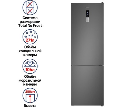 Количество камер: двухкамерный. Расположение морозильной камеры: снизу. Тип управления: сенсорное. Класс энергопотребления: A+. Система размораживания: No Frost. Общий объем холодильника: 377. Общий объем холодильной камеры: 271. Общий объем морозильной камеры: 106. Уровень шума: 42. Количество компрессоров: один. Мощность замораживания: 4.5. Количество полок: 4. Количество ящиков: 3. Материал полок: стекло. Зона свежести: есть. Антибактериальное покрытие: есть. Система размораживания: No Frost. Тип: Холодильник. Полезный объем холодильника: 351. Хладагент: R600a. Количество ящиков: 2. Вес (нетто): 67. Количество дверей: 2. Габариты упаковки (ед) ДхШхВ: 0.7x0.63x2.05. Вес упаковки (ед): 105. Страна производства: Китай. Количество полок на дверце: 6. Материал дверей: металл. Наличие морозильной камеры: есть. Технология автоматического размораживания морозильной камеры: Total No Frost. Технология автоматического размораживания холодильной камеры: Total No Frost. Технология многопоточного охлаждения: Multi Air Flow. Тип дисплея: внешний. Направление открывания двери: вправо. Гарантия: 12 мес.. Цвет: нержавеющая сталь. Потребление энергии: 324 кВт*ч/год. Размеры (ШхВхГ): 59.5 х 200 х 60 см. Климатический класс: ST. Индикация: звуковой сигнал незакрытой двери, температуры. Регулировка температуры/влажности в зоне свежести: регулировка влажности. Особенности конструкции: перевешиваемые двери, регулируемые по высоте ножки. Особенности холодильника: дисплей. Функции: режим отпуск, с…