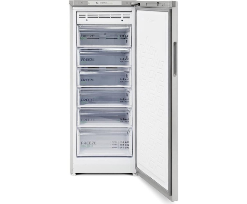 Морозильник с функцией холодильника; Габариты ШхВхГ, см: 60х145х62,5; Цвет: Металлик; Количество компрессоров: 1; Дисплей; Объем морозильной камеры: 230 л; Общий полезный объем: 160 л; Инверторный компрессор; Управление: Электронное; Количество камер: 1; Система Full No Frost; Мощность замораживания: 14 кг/сутки; Класс энергоэффективности: A+; Возможность перевешивания двери; Автономное сохранение холода: 12 ч; Минимальная температура в морозильной камере: -20 °C; Сигнализация повышения температуры в морозильной камере; Количество ящиков в морозильном отделении: 6; Блокировка от детей; Режим "Быстрая заморозка"; Суточный расход электроэнергии, при температуре окружающего воздуха 24°C: 67 кВтч; Индикация