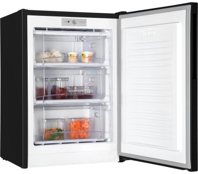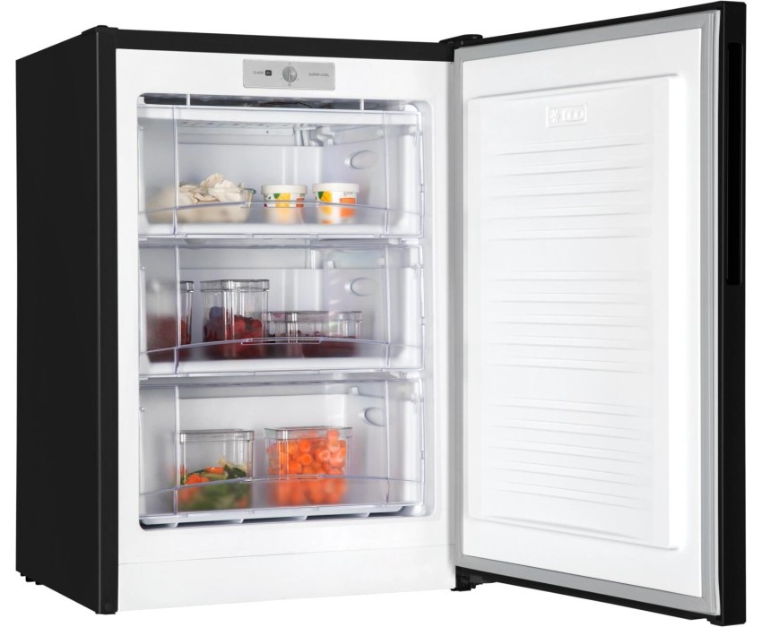 100 л, класс А+, 3 секций МК, 3 выдвижных ящика из пластика, 85х57х63 см, новая вертикальная ручка, съемный уплотнитель двери, цвет: черный матовый