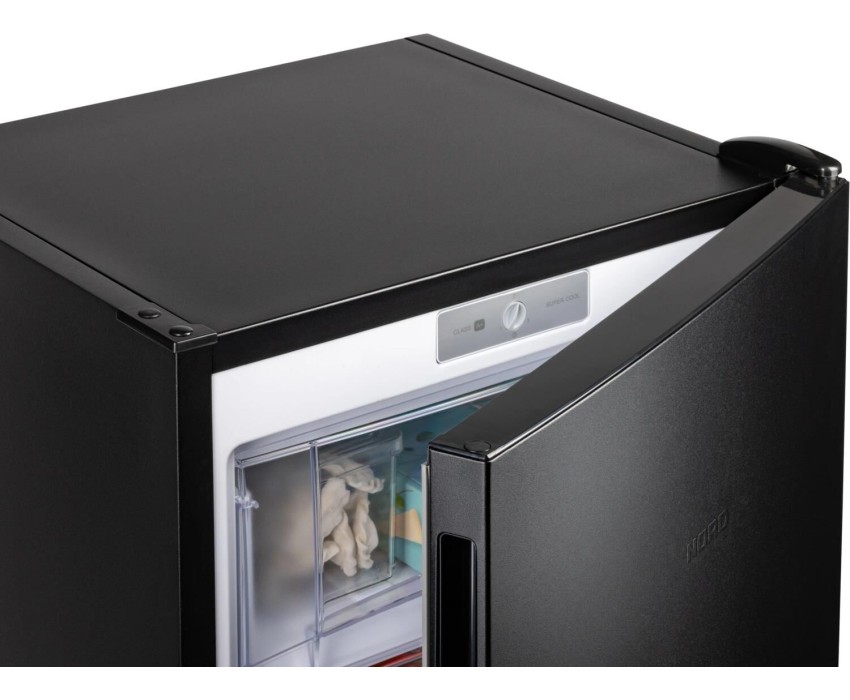 175 л, класс А+, 5 секции МК, 5 выдвижных ящика из пластика, новые вертикальные ручки, съемный уплотнитель двери, 128х57х63 см, цвет: черный матовый