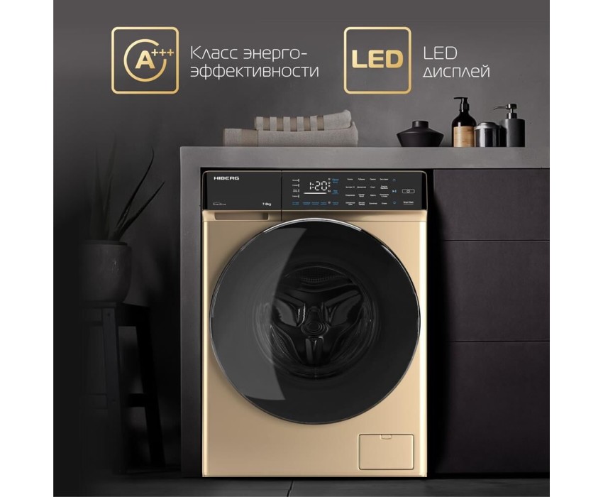 (ШхГхВ) 59,5х48х85см,Мотор Direct Drive Inverter Motor А+++, 16 программ, Максимальная загрузка белья – 7 кг, Скорость отжима max 1200 об, Защита от протечек -полная (AQUA STOP) Объем бака – 41 л, Диаметр двери – 52 см, Материал барабана – нерж. Сталь, Материал Корпуса – Полипропилен, Система управления дисбалансом, Система обнаружения ошибок, Блокировка от детей Напряжение, частота 220-240В/50Гц Цвет - Золотистый