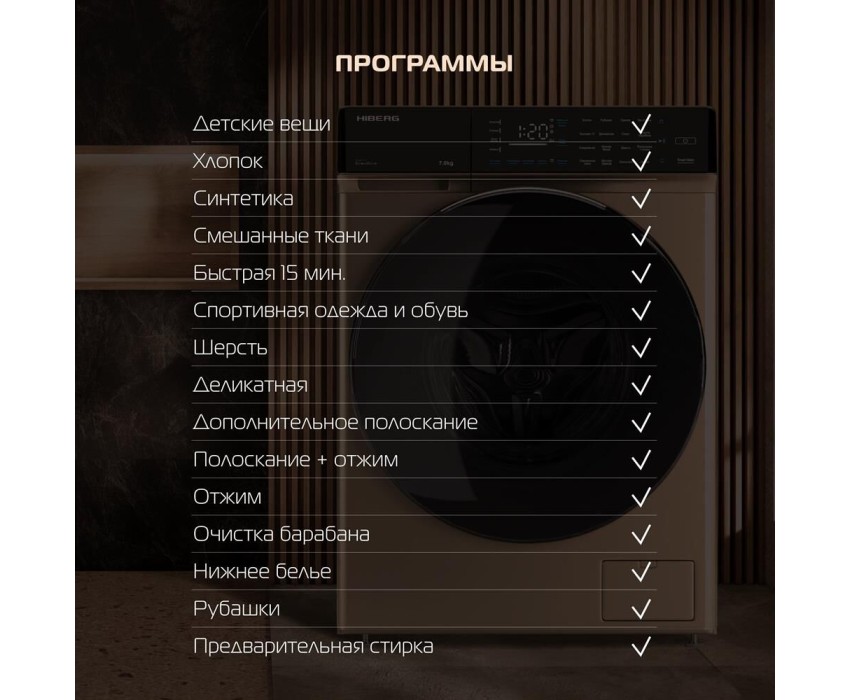 Smart Wash, экономичная программа, стирка шерсти, стирка хлопка, стирка спортивной одежды, стирка смешанных тканей, стирка синтетики, стирка детских вещей, стирка деликатных тканей, ручная стирка, полоскание, отжим, ежедневная стирка, дополнительное полоскание, быстрая стирка