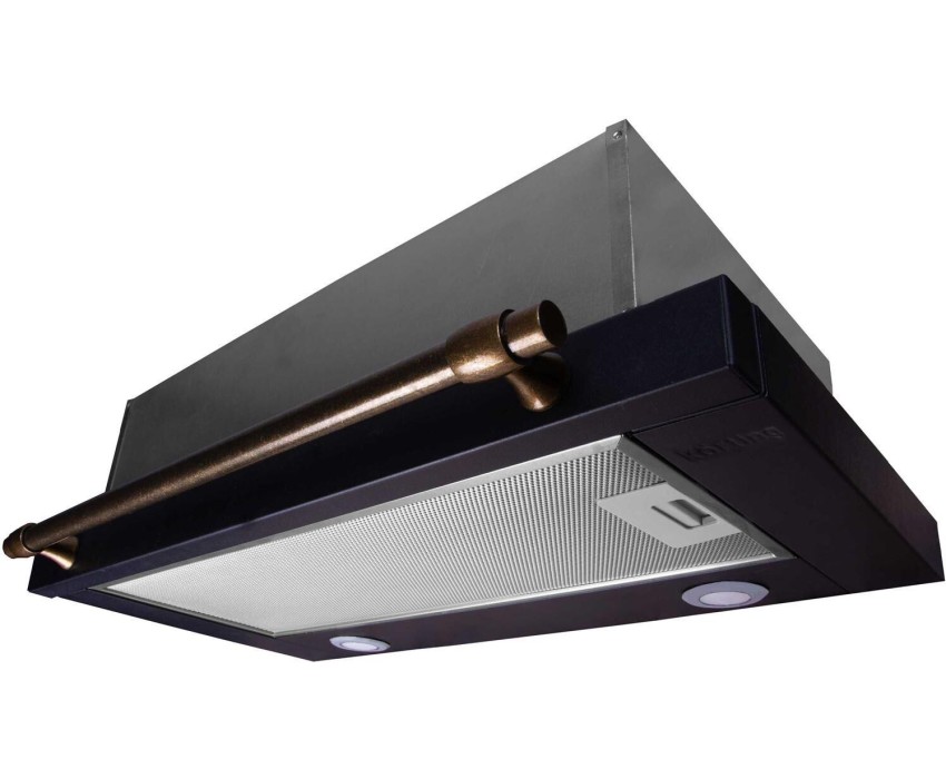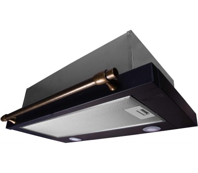 Встраиваемая вытяжка в выдвижным экраном в ретро дизайне,ширина 60 см, 3 режима, механическое управление, 650 м3/ч., алюминиевые жировые фильтры, LED освещениe - 2 лампы, ур.шума 57дб, рейлинг в цвете бронза, цвет - черный