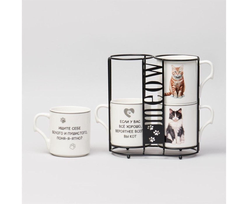Набор кружек LEFARD НАБОР КРУЖЕК "MEOW" 4ШТ НА ПОДСТАВКЕ 368МЛ. (КОР=8ШТ.) 153-946