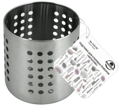 Подставка используется для сушки и хранения столовых приборов, кухонных лопаток и инструментов. Перед первым применением рекомендуется вымыть губкой или мягкой щеткой с жидким моющим средством, сполоснуть и просушить. Можно мыть в посудомоечной машине. Изготовлено из коррозионностойкой (нержавеющей) стали. Размер: диаметр 13 см, высота 12 см.