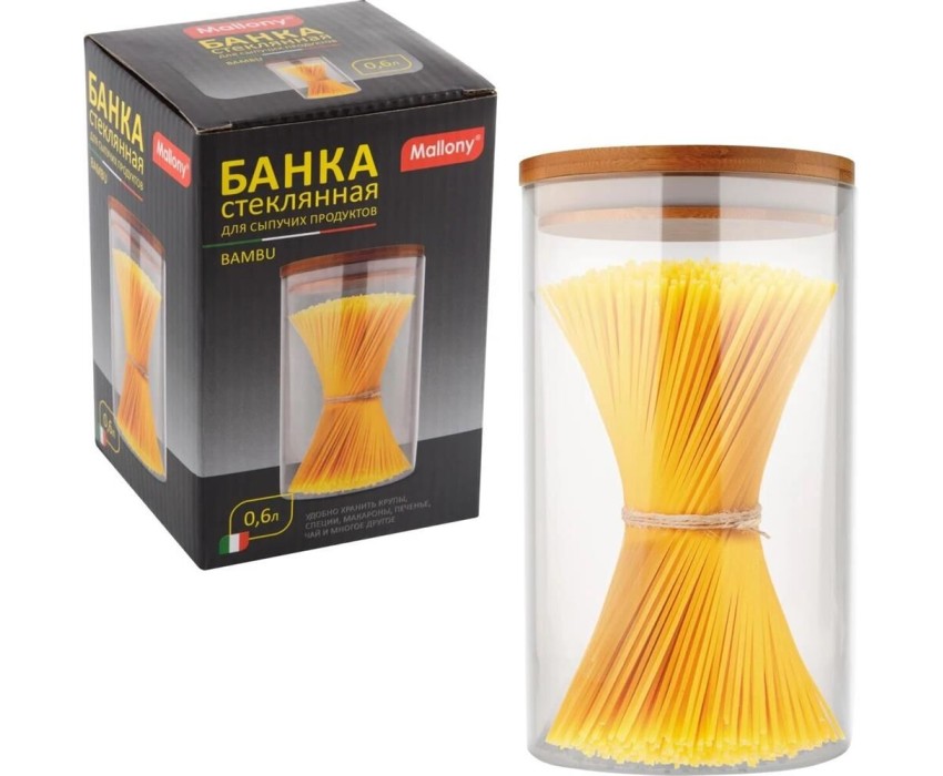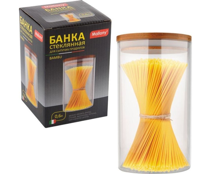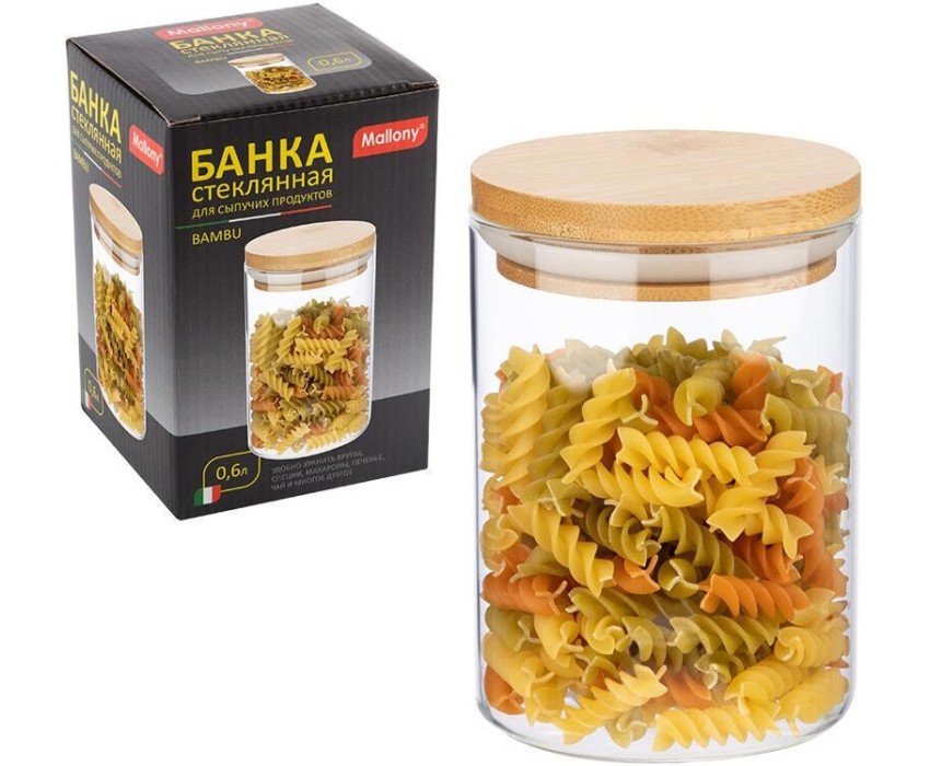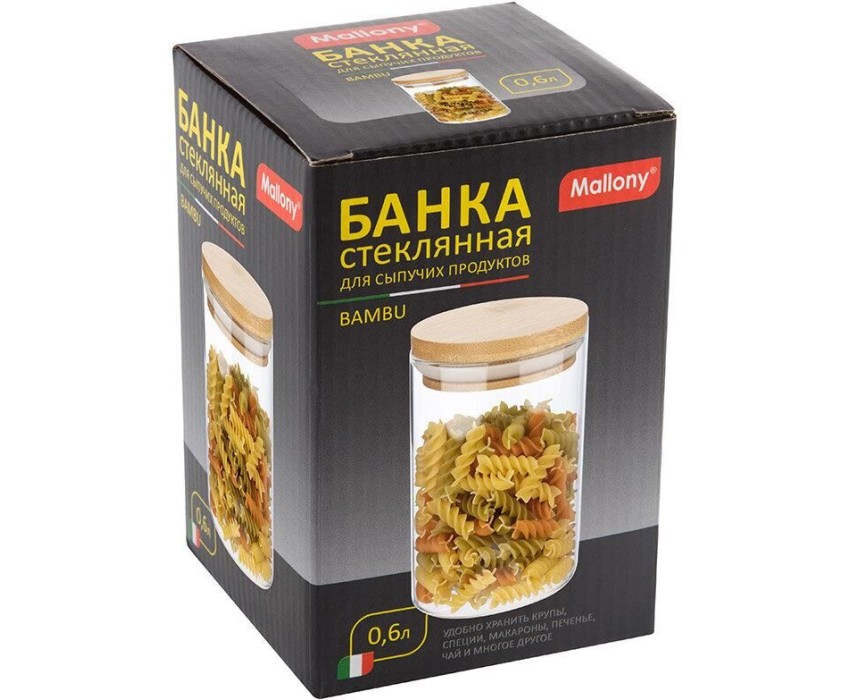 Стеклянная банка для сыпучих продуктов с крышкой из бамбука (прокладка из силикона) линейка — BAMBU, объем: 0,6 л, размер — 9,6*13,8 см Толщина стекла — 1.86 мм Можно мыть банку без крышки в посудомоечной машине. тм Mallony Материалы — боросиликатное стекло, бамбук, силикон. Коэффициэнт линейноо расширения — (3.3士0.1)×10-6/K Упаковка: цветная коробка.