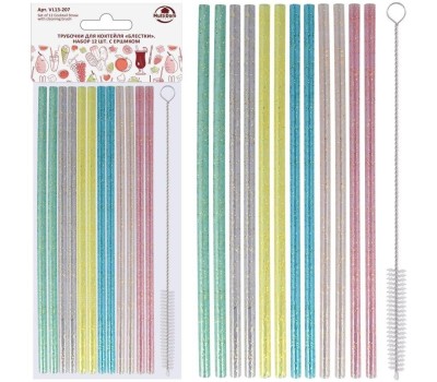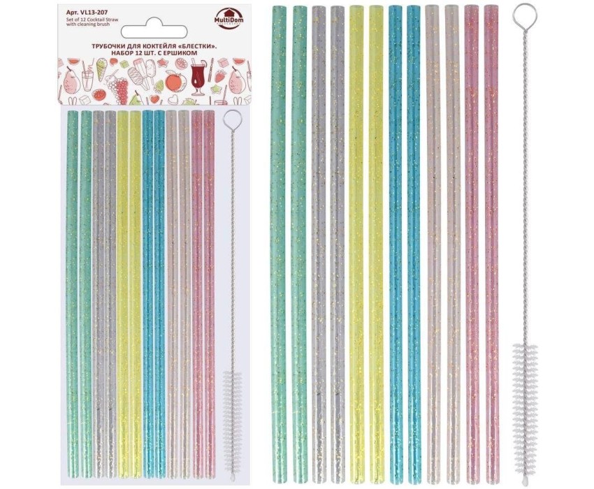 Трубочки для коктейлей – необходимый атрибут любой вечеринки, будь то праздник, семейное мероприятие или романтическая встреча. Без трубочек не обходится практически ни один коктейль Цветовая гамма трубочек и оригинальный блестящий дизайн порадует ваших гостей и близких. Рекомендуется помыть трубочки перед первым использованием. Для удобства мытья в комплекте предусмотрен ершик. С его помощью вы легко и быстро промоете внутреннюю часть трубочек, после чего их можно будет использовать повторно. Изготовлено: трубочки из пластмассы (полипропилен), ершик из металлической проволоки, щетина из полипропилена. Размер: длина трубочки 20 см, диаметр 0,6 см, общая длина ершика 20 см, диаметр рабочей части 1 см.