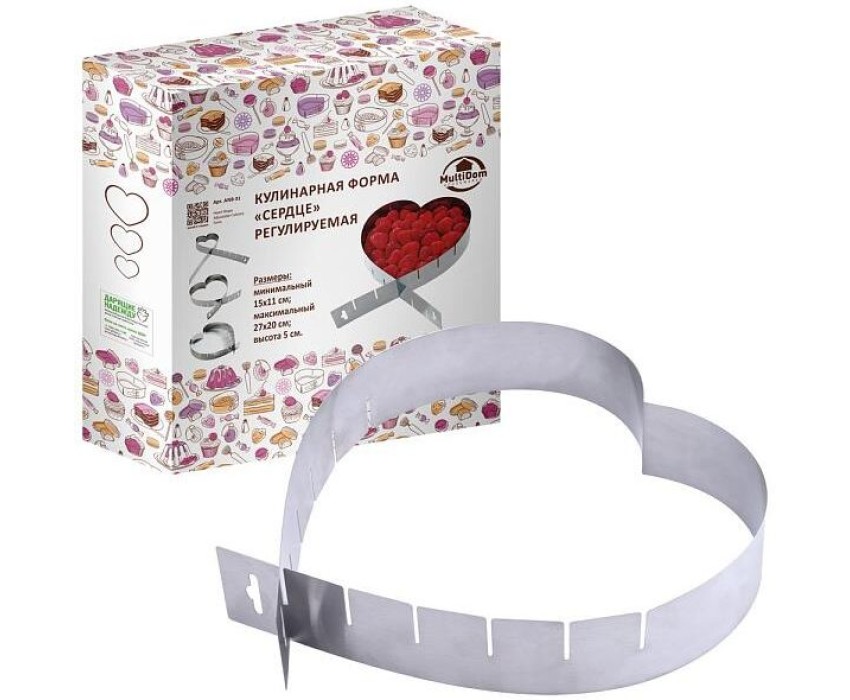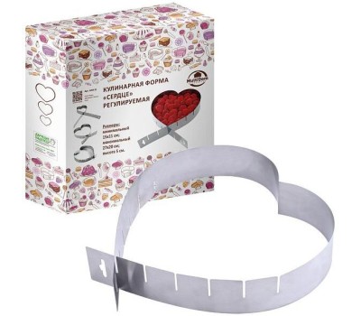 Кулинарные формы – удобное и незаменимое приспособление для любителей выпечки. Форма имеет регулируемый механизм, поэтому Вы сможете приготовить десерт или салат в форме сердца желаемого размера. Вы легко сможете испечь красивый и аккуратный торт, с ровными и четкими контурами или оформить салат в форме сердца для праздничного стола. Расположите форму на противне и выложите в нее тесто. Регулируемая форма станет Вашим незаменимым помощником на кухне или отличным подарком для друзей и близких. Выпекайте в духовке в соответствии с Вашим рецептом. Внимание! Форма не предназначена для жидкого теста. После использования легко и быстро моется. Подходит для использования в духовках. Не подходит для использования в СВЧ. Можно мыть в посудомоечной машине. Изготовлено из коррозионностойкой (нержавеющей) стали. Размеры: min 15х11см; max 27х20см; высота 5см.