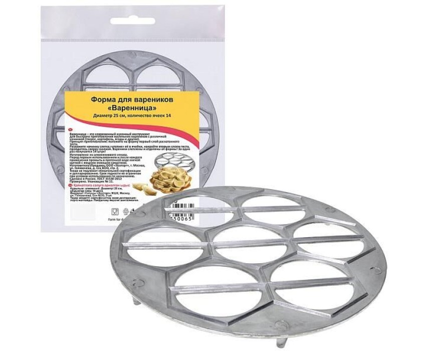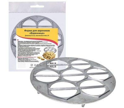 Принцип приготовления: положите на форму первый слой раскатанного теста. Разложите начинку слегка "утопив" её в ячейки, накройте вторым слоем теста, пройдитесь сверху скалкой. Вареники слеплены и отделены от формы! За оди раз получается 14 штук. Вареник-популярное блюдо из пресного теста с начинкой внутри. Варианты начинки могут быть разными: овощными, фруктовым, ягодными, мясными, рыбными, сладкими. Технология приготовления вареников такова: мука предварительно просеивается, затем в нее добовляются малыми дозами молоко, яйца, соль, сахар и растопленное масло. Тесто должно получится средней густоты. Диаметр 25 см, количество ячеек 14 штук. Изготовлено из алюминевого сплава.