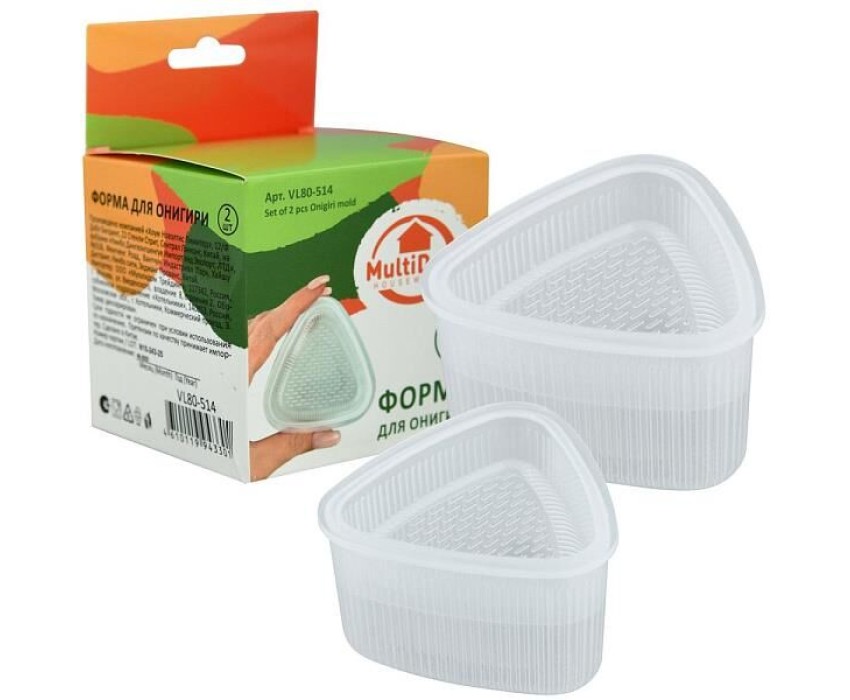 Используется в японской кухне для приготовления традиционного блюда с различными начинками и листочком нори. Форма для онигири - это легкий способ попробовать традиционную японскую кухню, помимо уже известных роллов и суши. Набор состоит из 2-х форм для онигири с крышкой-прессом. Формы очень просты в использовании: смочите их водой, заполните форму рисом и начинкой, слегка прижмите рис крышкой-прессом, легким нажатием на оборотную сторону формы, извлеките онигири. Благодаря рифленой поверхности, рис не прилипает к форме и легко отходит от стенок. Формы двух размеров, можно приготовить разные порции. Перед первым использованием и после каждого применения промыть в теплой воде, можно с жидким моющим средством, сполоснуть проточной водой и просушить. Можно мыть в посудомоечной машине. Изготовлены из пластмассы (полипропилен). Размеры: 6,5х6,5х4 см, 7,5х7,5х4,5 см.