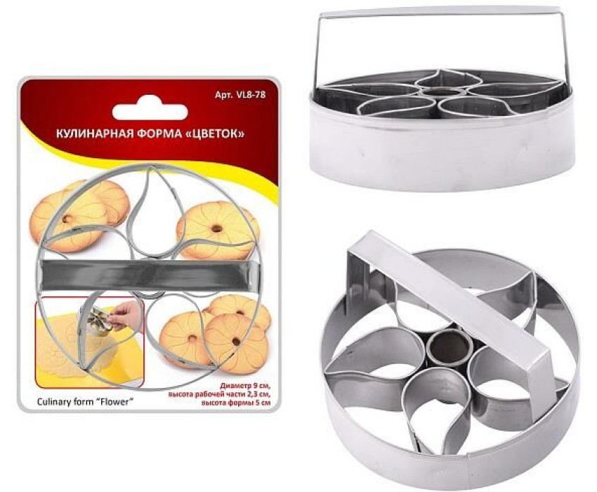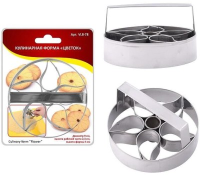 Кулинарная форма предназначена для вырезания фигур из теста или готового бисквита. Ручка, которой оснащена форма сделает ее использование удобным. -Раскатайте тесто, приготовленное по Вашему любимому рецепту; -Вырезайте с помощью формы круги, украшенные лепестками внутри; -Выпекайте при нужной температуре; Оригинальное печенье готово! Порадуйте своих родных и близких десертом собственного приготовления. Привлекайте к приготовлению детей, с этой формой это им под силу! С помощью этой формы вы сможете так же вырезать фигуры из готового бисквита. Лепестки внутри формы оставят оттиск на его поверхности, достаточно будет украсить десерт по своему вкусу и можно подавать его к столу! Изготовлено из коррозионностойкой (нержавеющей) стали.