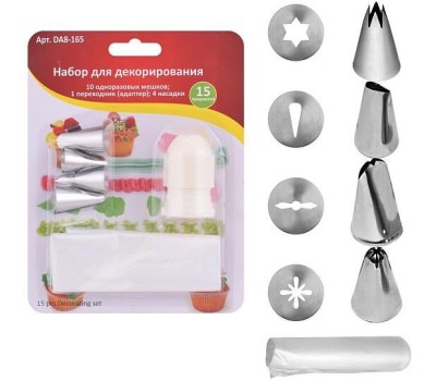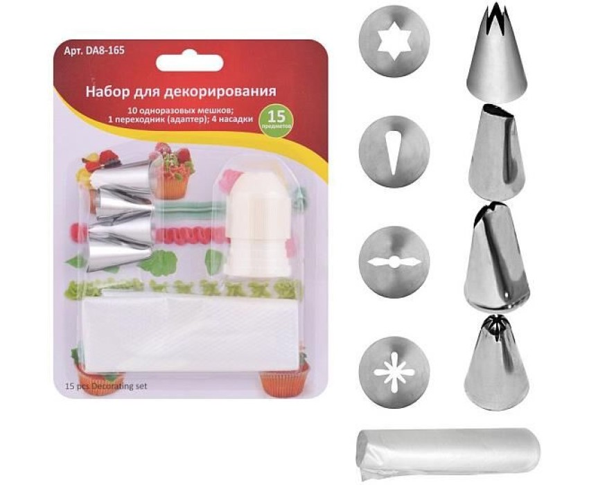 Набор предназначен для декорирования кондитерских изделий и выпечки. С помощью этого набора Вы сможете создавать из крема и глазури цветы, вензеля, узоры и фигурки не хуже профессиональных кондитеров. Украшайте с помощью набора для декорирования пирожные, печенье и торты разноцветными кремами или закуски густыми соусами. Фантазируйте и проявляйте свое творчество, привлекайте к украшению детей – совместное украшение может стать Вашей семейной традицией. Набор также станет отличным подарком Вашим родным и близким. Переходники (адаптеры) используется чтобы закрепить насадку с кондитерским мешком и обеспечить фиксацию, а также для того, чтобы к одному мешку с кремом можно было переставлять разные насадки. Очень прост в использовании: -отрежьте нижнюю часть мешка; -вставьте внутрь мешка одну часть адаптера с резьбой; -поверх мешка с адаптером наденьте металлическую насадку; -зафиксируйте насадку на мешке с помощью кольца с резьбой; -наполните мешок кремом; -выдавливайте содержимое мешка на выпечку. В набор входит: 10 одноразовых мешков; 1 переходник (адаптер); 4 насадки. Изготовлено: мешки из полиэтилена, адаптеры из пластмассы (полипропилен), насадки из коррозионностойкой (нержавеющей) стали.