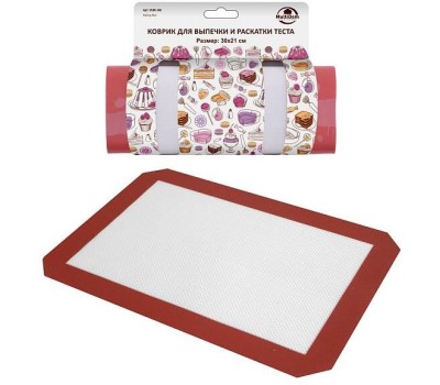 Для удобства раскатывания теста, для запекания и приготовления пищи в духовке используйте силиконовый антипригарный коврик. Преимущества материала: гигиеничный, безопасный, выдерживает высокие температуры до 220 градусов, к силикону не пристает тесто во время раскатки и пища после запекания. Такой коврик для запекания обеспечивает равномерное распределение температуры. Изделие не рвется, не мнется, занимает мало места на кухне. Рекомендуется мыть силиконовый коврик вручную, используя мягкую губку. Не используйте для мытья грубые щетки и абразивные средства. Перед использованием также рекомендуется промыть и просушить коврик. Не режьте продукты и тесто на коврике ножом! Изготовлен из силикона, армированного стекловолокном. Размер 30х21см.