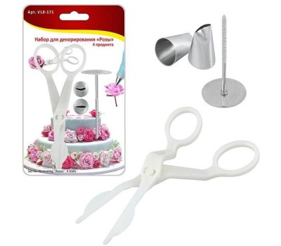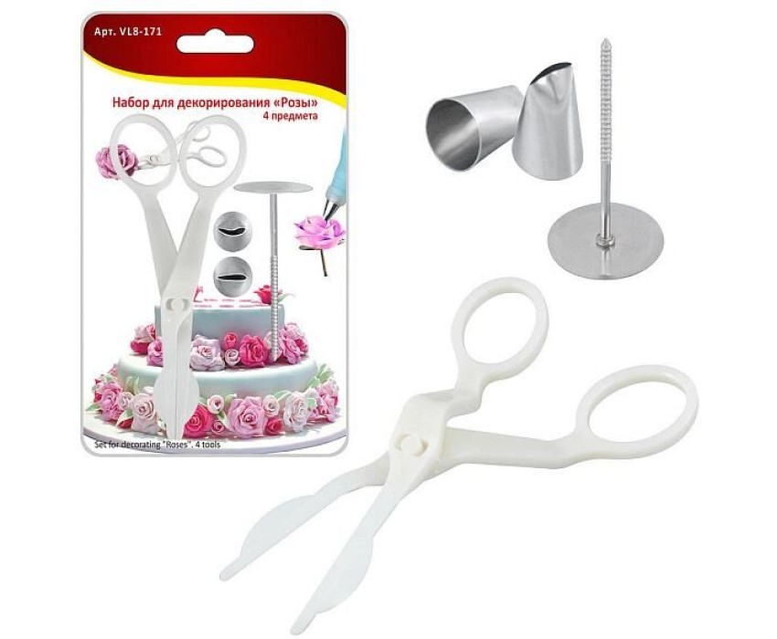 Создавайте кулинарные шедевры на своей кухне! Создание кремовых роз – творческий и увлекательный процесс. Для этого существуют специальные насадки, кондитерский гвоздь и ножницы для перемещения цветов из крема. Насадки выполнены из нержавеющей стали, имеют прорези в виде лепестков, из которых формируются кремовые цветы. Специальный кондитерский гвоздь предназначен для формирования цветов на плоской поверхности. Для переноса цветка используются ножницы, позволяющие аккуратно захватывать розочку, чтобы не повредить ее. Кремовые розы – беспроигрышный вариант для украшения тортов, пирожных, капкейков и других кондитерских изделий! После использования вымойте инвентарь водой с моющим средством. Изготовлено: насадки и кондитерский гвоздь из коррозионностойкой (нержавеющей) стали, ножницы из пластмассы (ABS). Размер насадок: верх/низ 0,5 / 1,8см, высота 2,8см; гвоздь 7х3,2см; длина ножниц 13,5см.