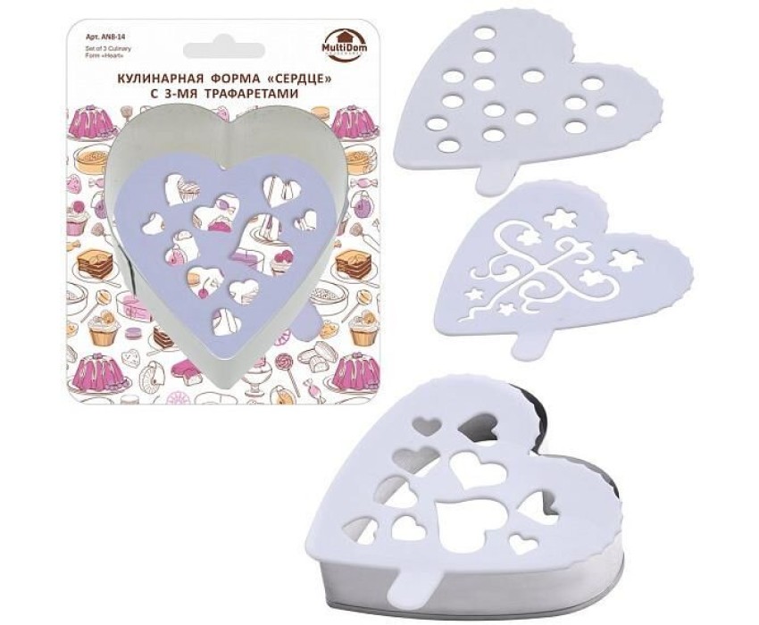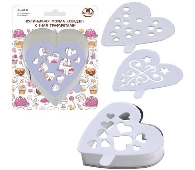MULTIDOM Кулинарная форма "Сердце" с 3 трафаретами. Размер 8х7,5см, высота 2,5см. AN8-14
