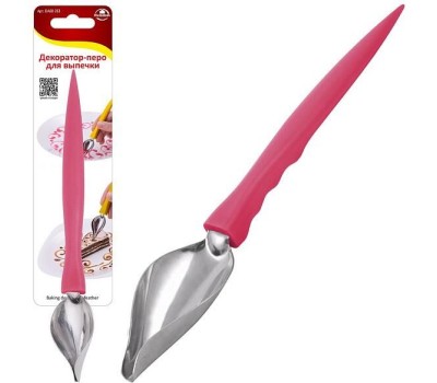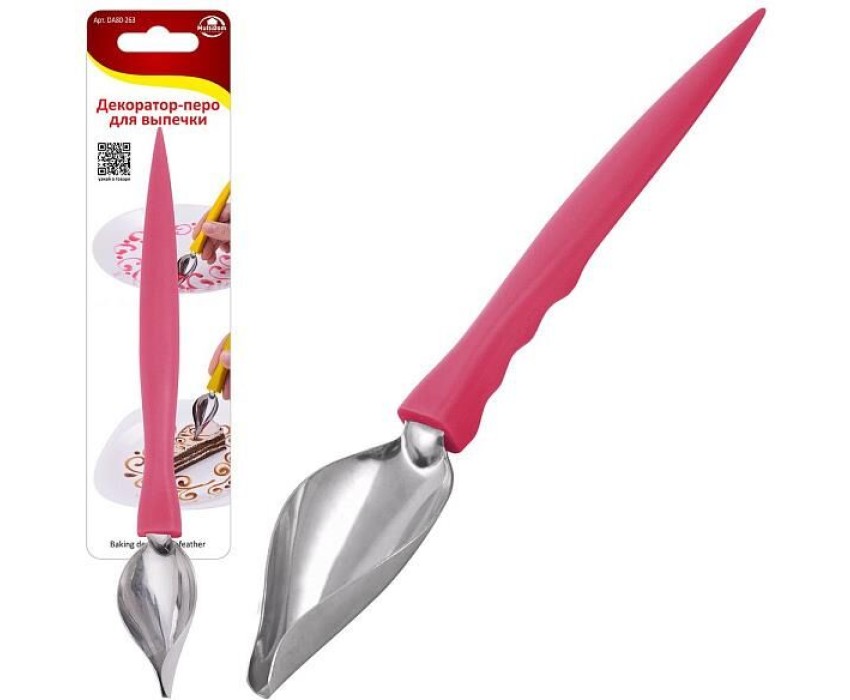 Декоратор-перо поможет Вам красиво оформить кондитерские изделия и украсить блюда на уровне профессионального повара. С его помощью можно нарисовать плавные и зигзагообразные линии, капли, перетекающие одна в другую и другие элементы декора. Для рисования можно использовать различные соусы, шоколадные и фруктовые сиропы. Декоратор-перо может стать приятным подарком для любителей вкусно готовить и красиво оформлять блюда. С помощью этого декоратора Вы сможете украсить не только блюда, но и тарелки, на которых они будут поданы к столу. После применения рекомендуется мыть мягкой щеткой с использованием жидких моющих средств. Хранить в сухом месте. Изготовлено: рабочая часть из коррозионностойкой (нержавеющей) стали, ручка из пластмассы (полипропилен).