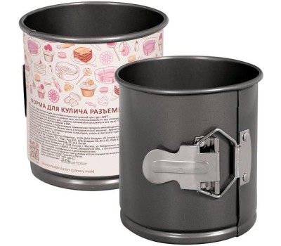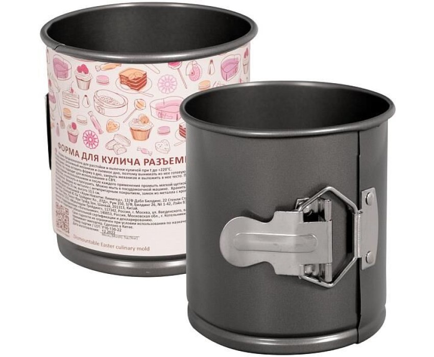 Форма предназначена для расстойки и выпечки куличей при t до +220°С. Форма имеет разъемный механизм и съемное дно, поэтому вынимать из нее готовую выпечку очень легко и удобно. Необходимо лишь вставить форму в дно, закрыть механизм и выложить в нее тесто. Подходит для использования в духовках. Не подходит для использования в СВЧ. Изготовлено: форма из металла с антипригарным покрытием, замок из металла с хромированным покрытием. Размер: диаметр 10 см, высота 10,5 см.