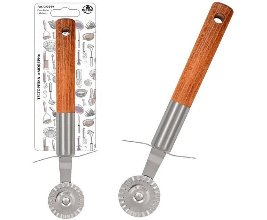Используется во время приготовления блюд из теста: пиццы, пельменей, выпечки и т. п. Изготовлено: рабочая часть из коррозионностойкой (нержавеющей) стали, ручка из дерева. Общая длина 20 см.