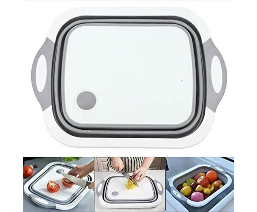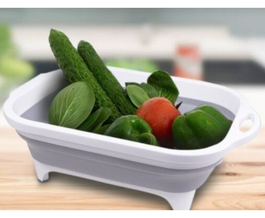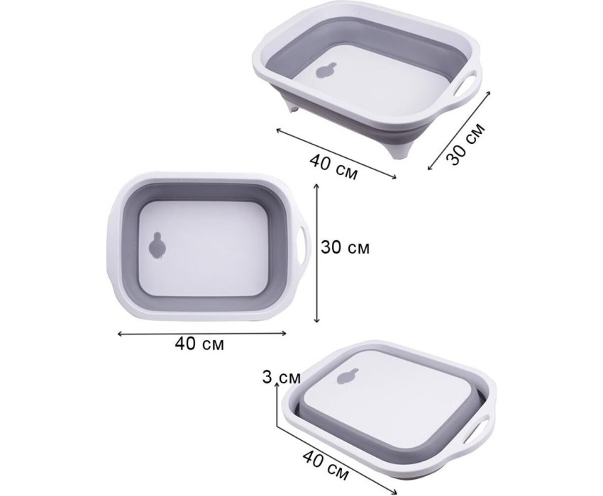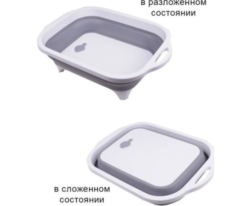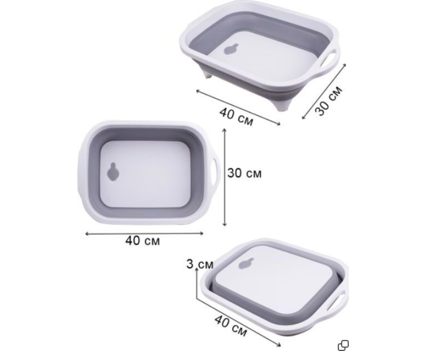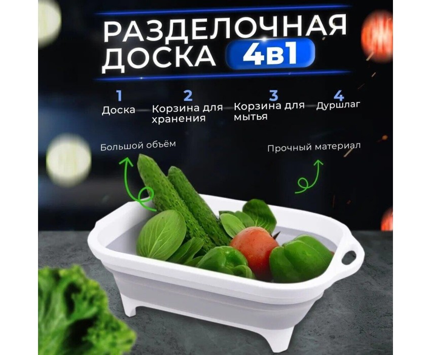 Складная корзина 4 в 1 Разделочная доска Складная корзина совмещает в себе несколько предметов! Это легкая и емкая корзина для хранения продуктов, а так же органайзер для кухни. Ее можно использовать как дуршлаг, благодаря съемному сливу-нет необходимости поднимать и переворачивать тяжелую емкость. Удобные ручки помогут легко положить и вынуть корзину из раковины. Наличие противоскользящих ножек делает ее прочной и устойчивой. А в сложенном виде-это прочная и удобная доска для нарезки с ручками и желобами для слива соков. Кроме того, ее просто и компактно хранить, она портативна, поэтому идеальна для использования вне дома и на открытом воздухе. Изготовлена из пищевого пластика премиум-класса PP+TPR материала, без бисфенола, очень прочная, стойкая к запахам и устойчива к пятнам. Силикон высокого качества, что обеспечивает долгий срок службы и удобство в применении. Внимание! Изделие прочное и плотная резина складывается при усилии, необходима аккуратность.